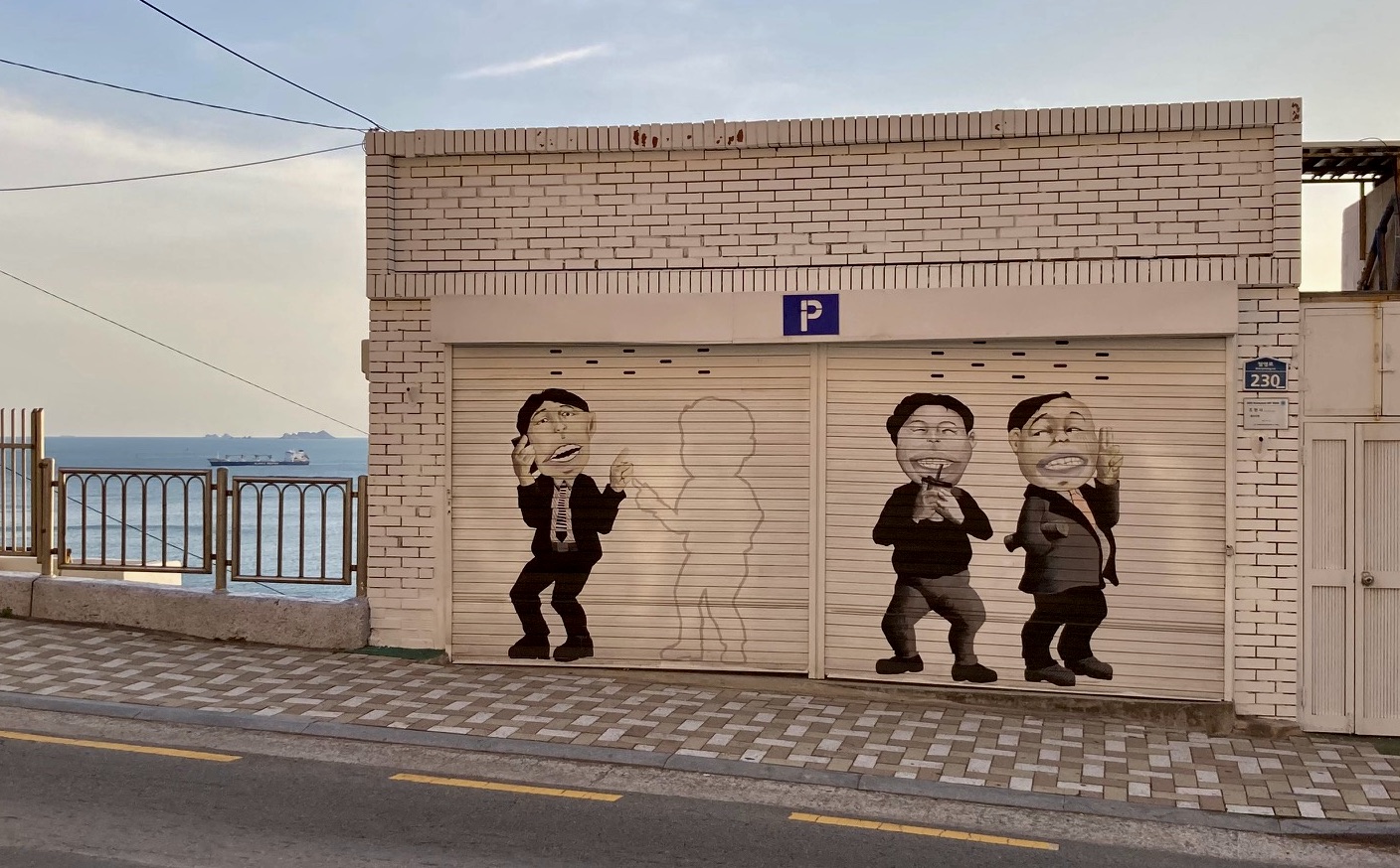 월초에 부산을 여행하는 동안 가장 많이 걸은 동네는 영도다. 해변에 있는 흰여울마을 골목길과 모모스 로스터리, 초원복국을 걸어 다녔다. 첫날 피곤한 다리로 정류장 작은 벤치에 앉아 10분 후 도착할 마을버스를 기다리는데(부산도 버스 도착 시간 전광판 알림 서비스를 하고 있었다), 건너편 주택의 주차장 셔시에 코믹한 그림이 보였다.