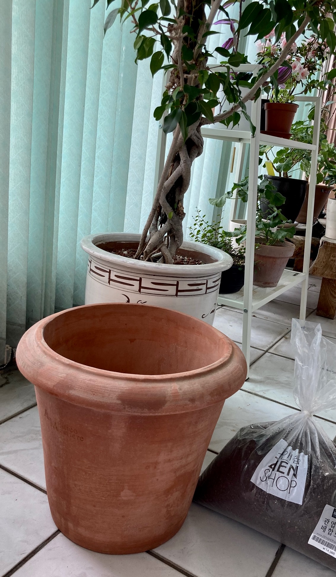 꽤 크고 무거운 이태리 PAM 몬테루포 35호와 PBE 오리진 30호 토분 하나씩, 흙도 갈아줄 겸 5kg 들이 배합토 두 봉지를 사 와서 벤자민과 몬스테라를 분갈이해 주었다. 물론 나는 들어만 주고 가드닝 작업은 아내 몫이다. 벤자민은 십 년 넘게 우리와 동고동락 중인데, 키가 많이 컸다. 몬스테라는 수태봉까지 만들어 주었는데, 어울리는 화분에서 분갈이 몸살을 앓지 않고 잘 자라주면 좋겠다.