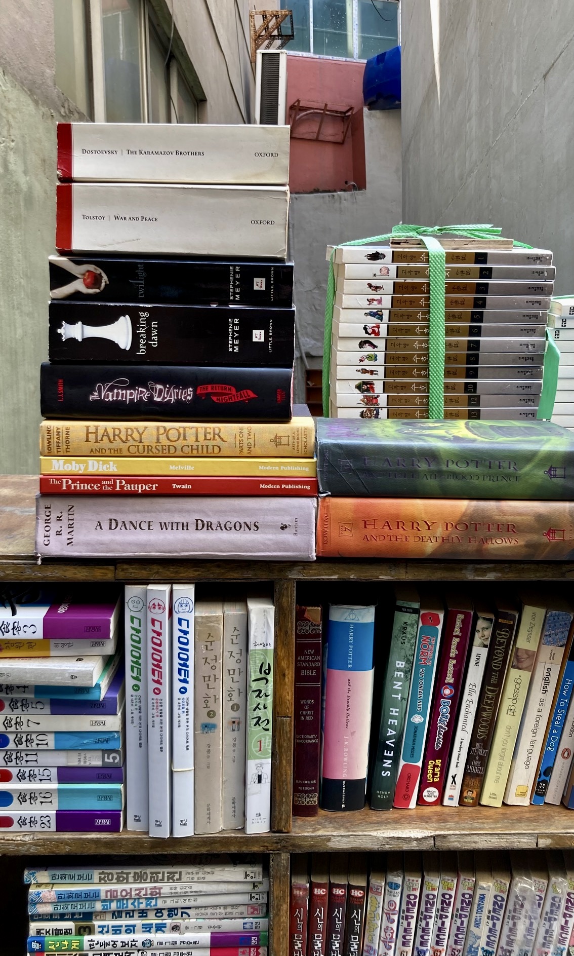 성경책과 영어사전을 필두로 내세우는 건 헌책방들의 필수 아이템인듯 싶다. 둘 다 글자가 깨알 같고, 필요한 부분을 펼쳐 읽거나 밑줄치며 읽었던 것들이다. 헌책방에 원서가 빠지면 서운한데, <까라마조프의 형제들> <해리 포터>도 눈에 띄고, <신의 물방울> 등 각종 만화책이 반겨주었다.