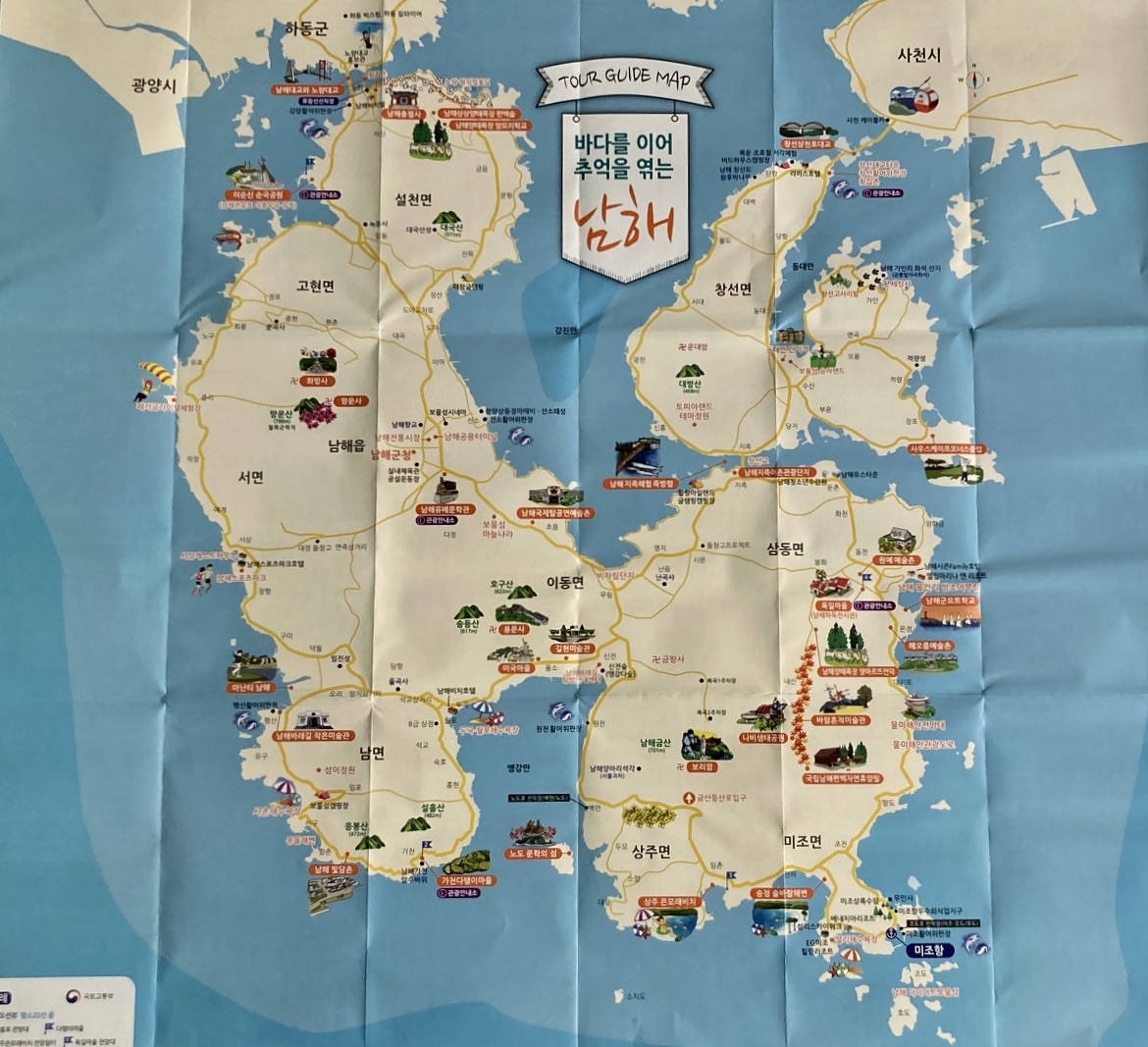 금토일 2박3일 남해 가족 여행을 하고 있다. 남해는 경남 삼천포(사천)와 하동 아래 있는 섬인데, 지금은 삼천포대교, 남해대교, 노량대교로 연결돼 자동차로 편히 다닐 수 있다. 제주도-거제도-진도-강화도에 이어 다섯 번째로 큰 섬(3개의 유인도와 76개의 무인도)인데, 서울 반 정도 되는 넓은 땅에 4만 명 조금 넘게 살고 있다.