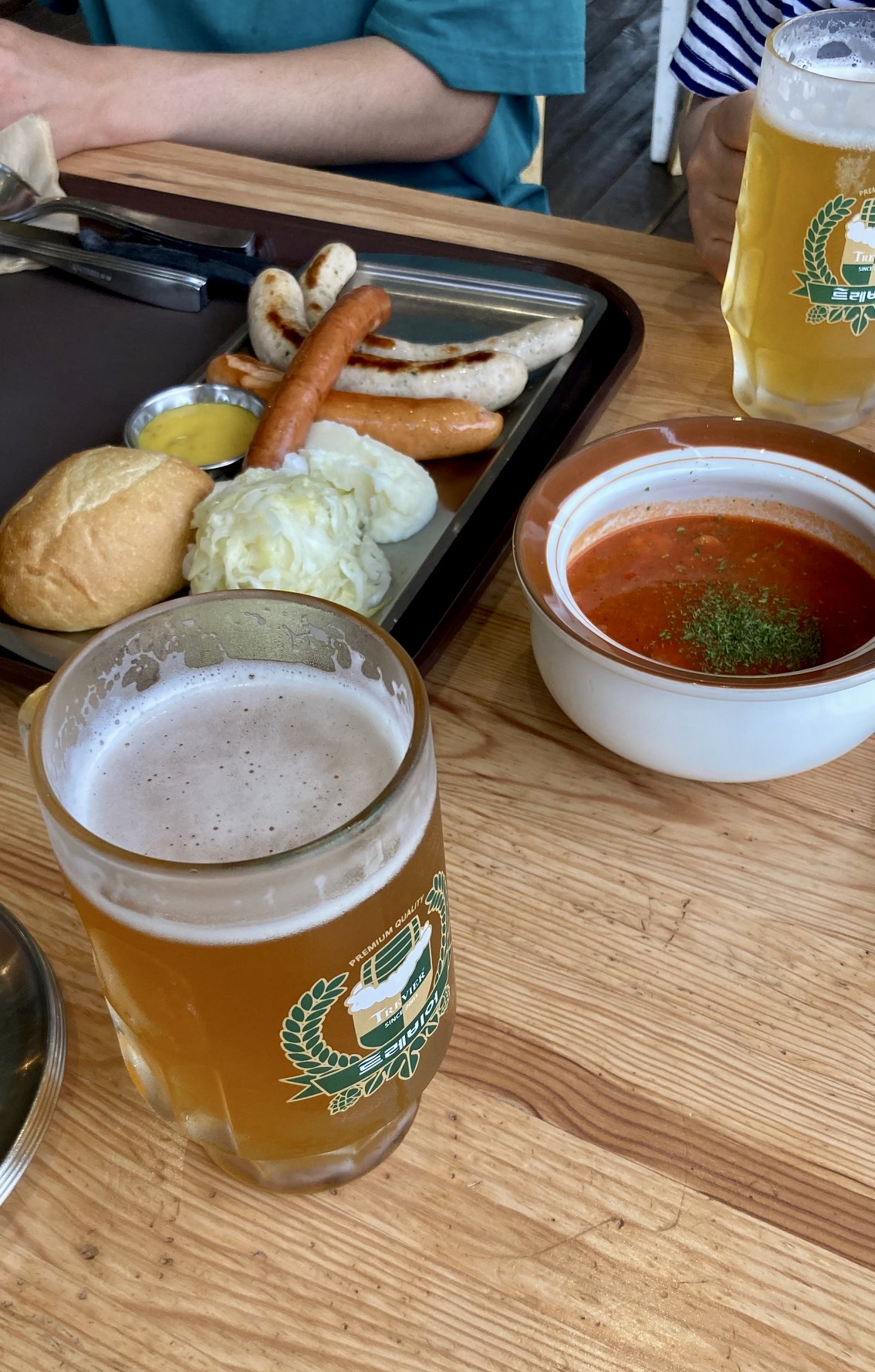독일 맥주와 소세지로 저녁을 대신했는데, 평이 좋은 부어스트라덴과 완벽한 인생 중 독일어로 된 집 2층 창가에 앉았다. 굴라쉬(진한 야채수프), 커리 부어스트, 소세지, 슈바인학센(독일식 족발) 모두 맛있었다. 막 문을 닫으려는 독일빵집에서 세 종류를 사서 아침에 유자 쥬스와 함께 먹었다.