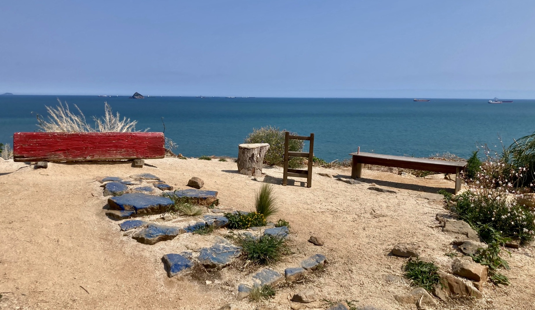 둘째날 오후 다랭이마을 한 귀퉁이엔 바삐 다니지 말고 앉아서 숨을 고르면서 천천히 망망대해를 감상하라는듯 벤치와 의자, 돌이 놓인 전망 포인트가 인상적이었다. 푸른 바다와 대비되는 빨간색 벤치도 센스 있고, 저 멀리 떠 있는 작은 섬의 존재는 심심하지 않게 해 주었다.