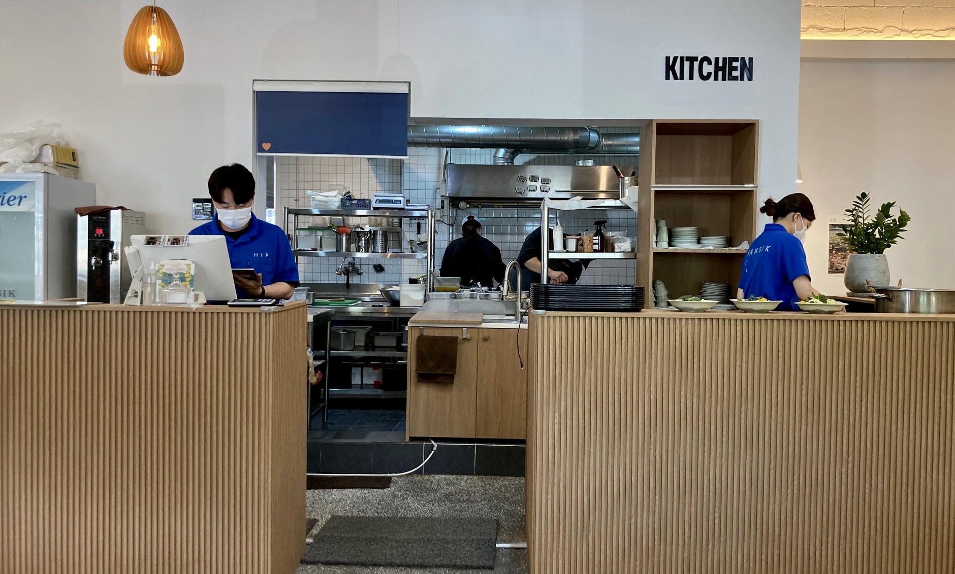 11시에 오픈하는 식당에 아예 9시에 가서 g를 내려놓고 대기하다가 10시부터 받는 예약을 시도했다. 작전 성공으로, 다행히 10시 반에 전체 2번으로 입장할 수 있었다. 그 동안 g는 근처 해변에서 몽돌을, 나는 해무가 낀 남해 바다를 구경하고, 아내와 아들은 숙소에서 좀 더 쉬다가 합류했다. 이름 그대로 내외관이 깔끔하고 힙해서 기대감을 부추겼다.