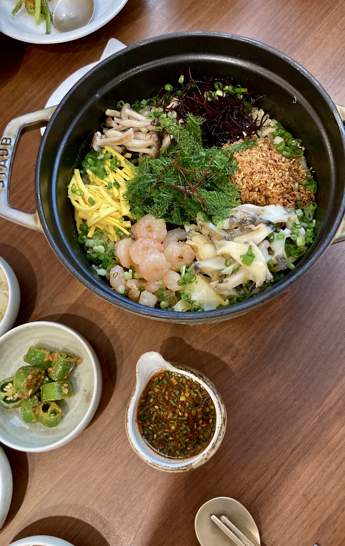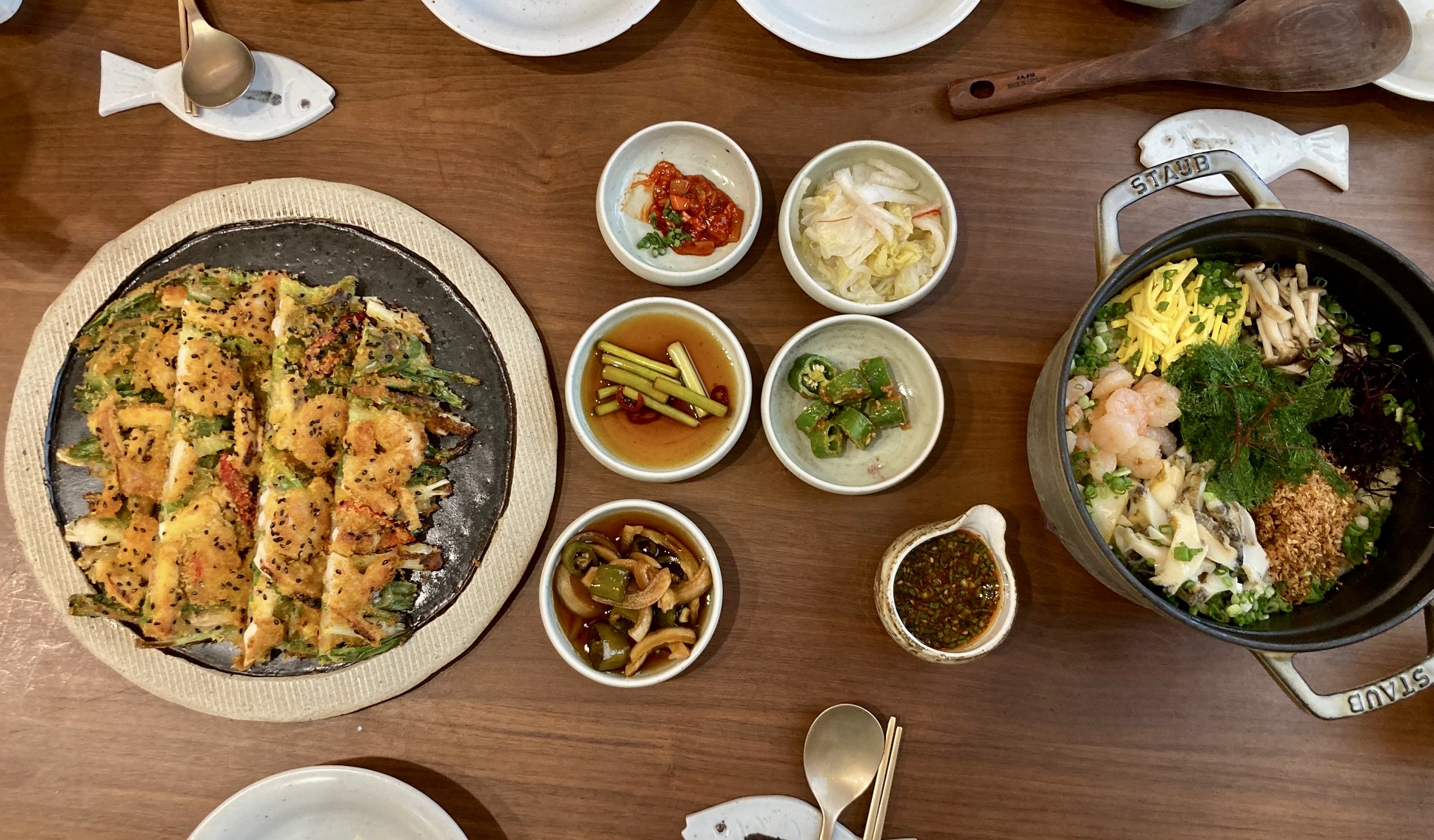 이 집의 메뉴는 전복솥밥과 바삭 해물파전, 숯불 목살구이인데, 모두 시켰다. 전복 내장을 넣고 전복과 감태 등이 올라간 무쇠솥밥은 비주얼이며 맛이 힙했고, 나머지 두 메뉴도 손색 없는 맛으로 예약 전쟁을 뚫고 입장한 우리를 즐겁게 해 주었다. 밥이 될 때쯤 열 개의 테이블에 순차적으로 입장시키는 것도 좋아 보였다.