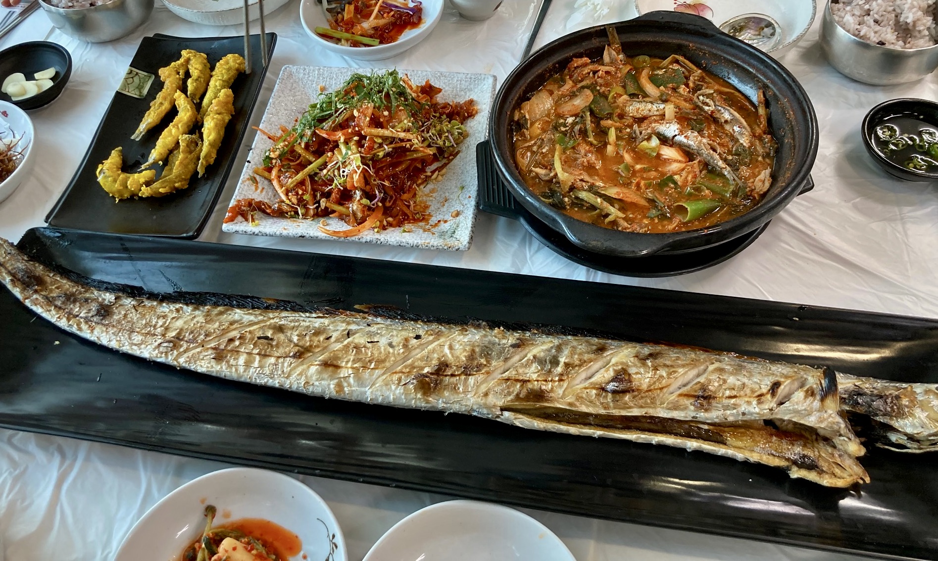 갈치는 얼추 세 뼘 반 길이였으니 70cm 가까이 됐는데, 1터는 안 되니 대갈까진 아니어도 중갈은 족히 되겠다 싶었다. 숟가락으로 갈치 옆 부분 가시를 제거해 주어서 두툼한 살만 발라 먹기 쉽게 해 주는 서비스도 근사했다. 다시 남해를 찾으면 수수한 백반집에서 하는 멸치쌈밥도 먹어보고 싶다.