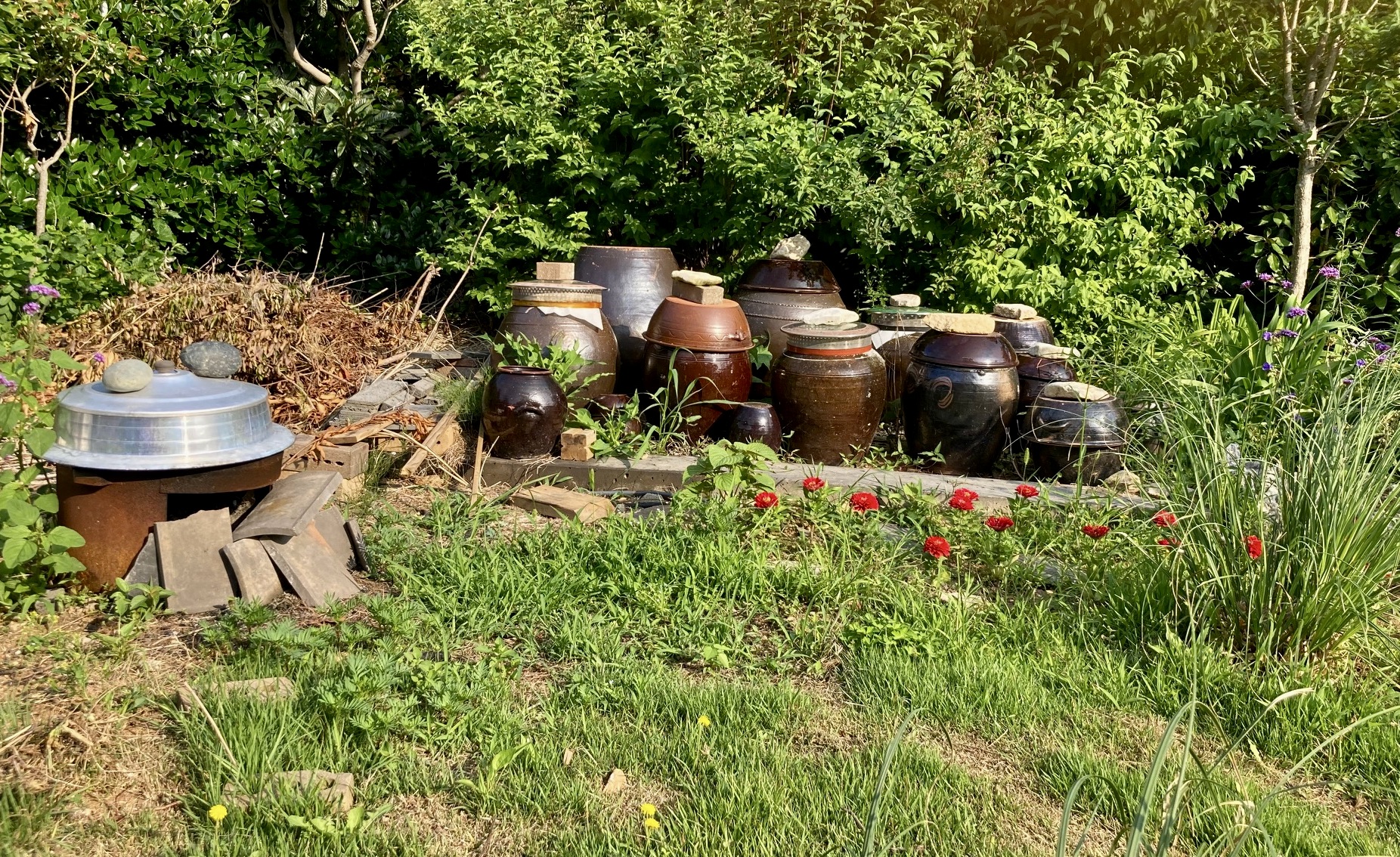 2박을 머문 숙소에도 마당이 있었는데, 주인이 근처에 살고 있는지 장독대 항아리들마다 뚜껑이 덮였고, 그 위를 돌들이 누르고 있었다. 남해도 섬이니까 제주도처럼 바람이 많아 뚜껑이 날아가지 않게 하려는 건지, 아니면 이렇게 눌러주어야 항아리 속에 있는 장류가 잘 보존되는 건지 모르겠다. 그 옆 알루미늄 솥뚜껑도 돌 두 개가 누르고 있었다.
