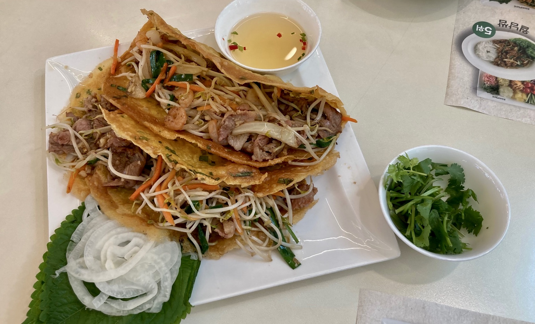 광화문 아시안 푸드 식당 반포식스에서 베트남식 부침개 반 쎄오(Bánh xèo)를 먹었다. 쌀가루 반죽을 기름에 얇게 부쳐 그 위에 숙주, 양파, 돼지고기, 새우 등을 얹고 익혀서 반으로 접어 낸 것이다. 오이, 파인애플 등 월남쌈 만드는 재료들이 들어갈 수도 있을 것이다.