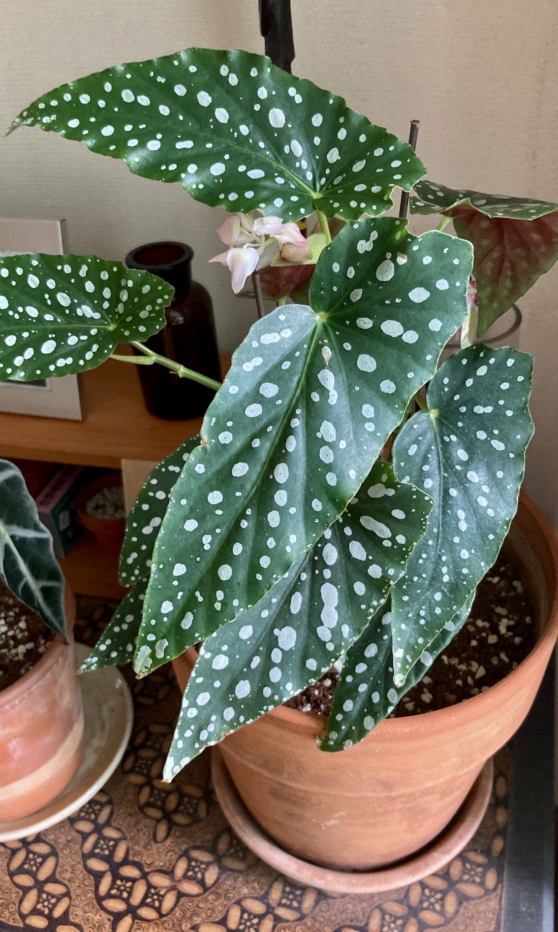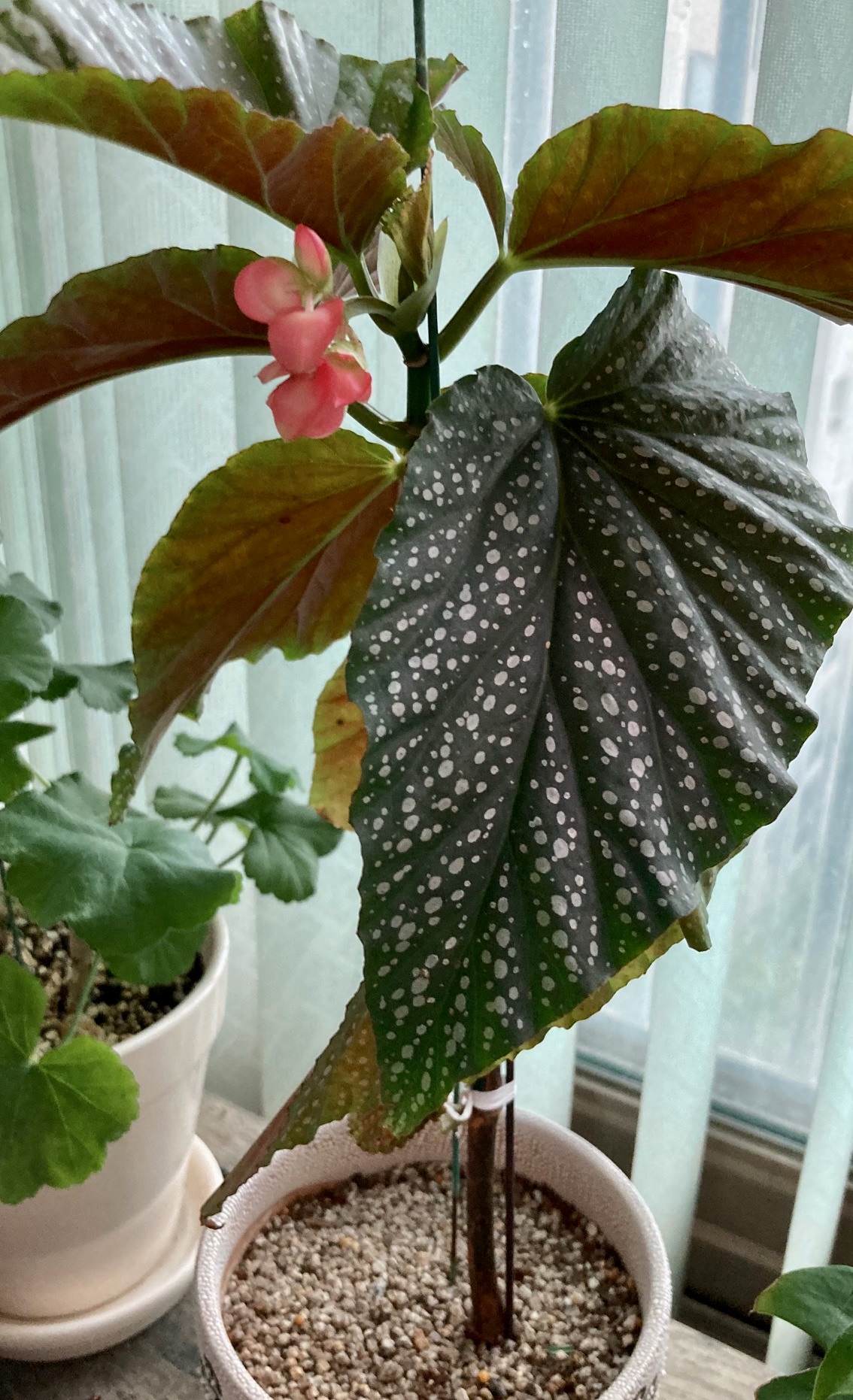 베고니아 화분이 두세 개 있다. 작년에 청주 처제네 갔을 때 길다란 점박이 잎이 특징적인 걸 분양 받아왔고, 또 하나는 몇 달 전 하나로마트에서 잎 모양이 조금 다르길래 사 와서 분갈이 해 준 거다. 몬스테라가 그렇듯이, 베고니아도 뒤에 뭐라뭐라 붙으면서 조금씩 다른 종류가 있는 모양이다.