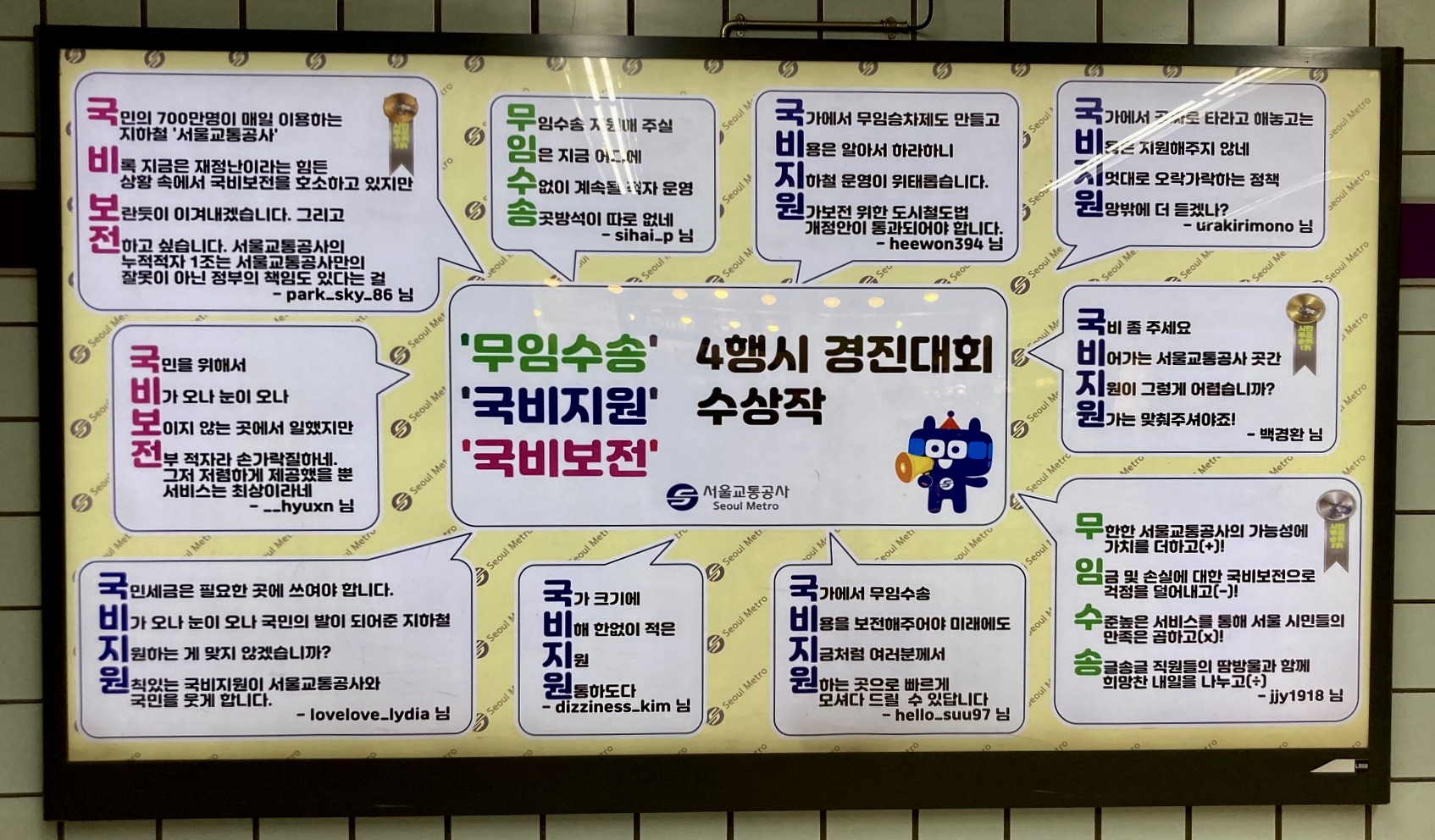 무임수송, 국비지원, 국비보전을 주제로 지하철공사 측의 애환을 반영하는 시들이 선정된 것 같았다. 실명도 있지만, 대부분 이메일 ID로 돼 있고 이 세 가지를 성토하는 듯한 내용으로 봐서, 직원들이나 관계자들이 작성한 것이 아닐까 생각된다.