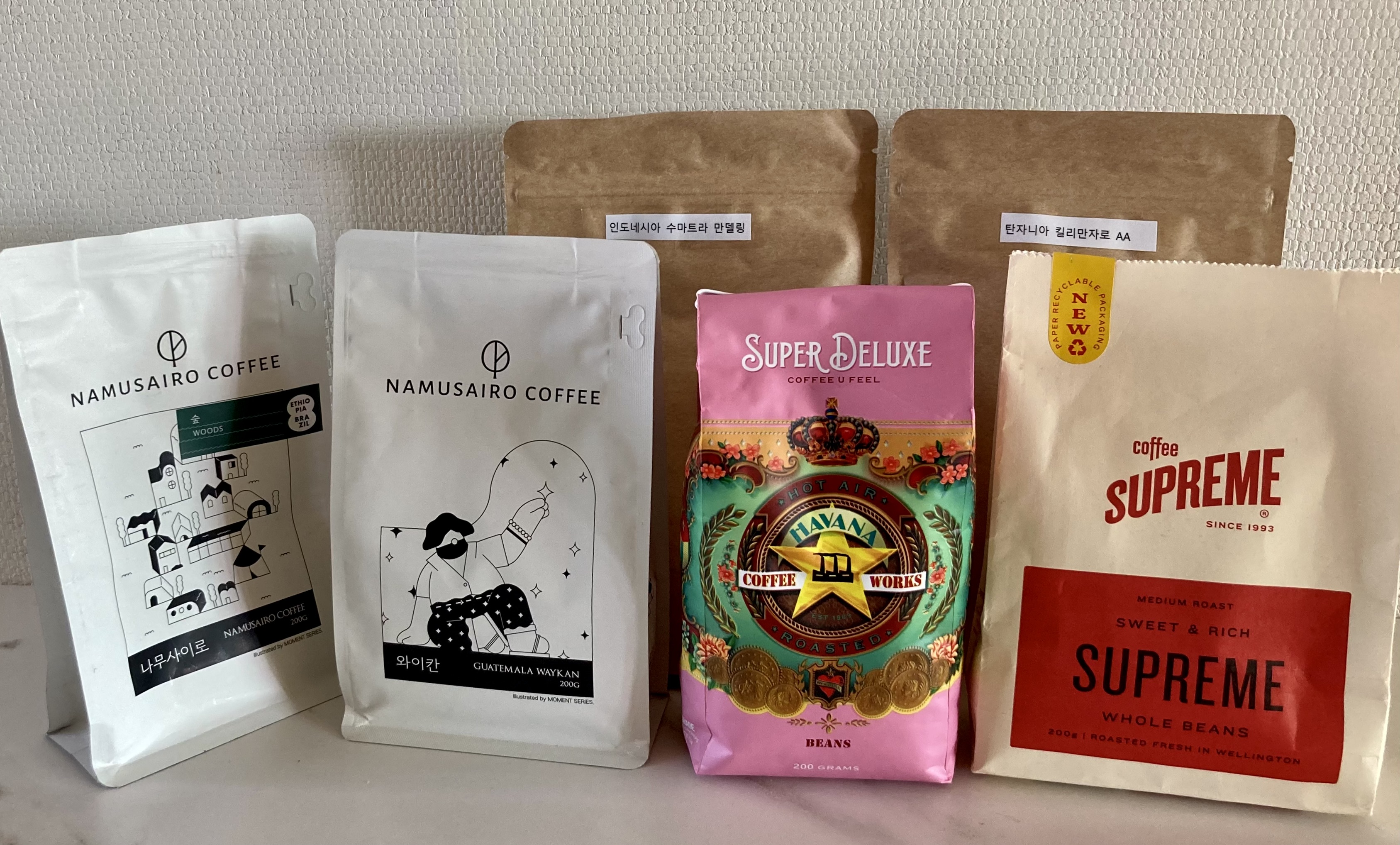뉴질랜드에서 온 폴모 부부는 커피 원두에 쿠키에 와인까지 가져와 즐겁게 해주었다. 분홍색 하바나는 오클랜드 베이글 맛집 Best Ugly(12/19/18)에서 마셔봤는데, 그때의 추억과 맛을 음미해 보라는 것 같다. 지금 마시고 있는 수프림(12/5/17)은 웰링턴에서 로스팅한 것으로 이름 그대로의 맛을 선사한다. 지난주엔 그친구들 모임이 있었는데, 포항공대 장 교수가 집에서 손수 로스팅한 원두를 두 봉 선물해 주었다.