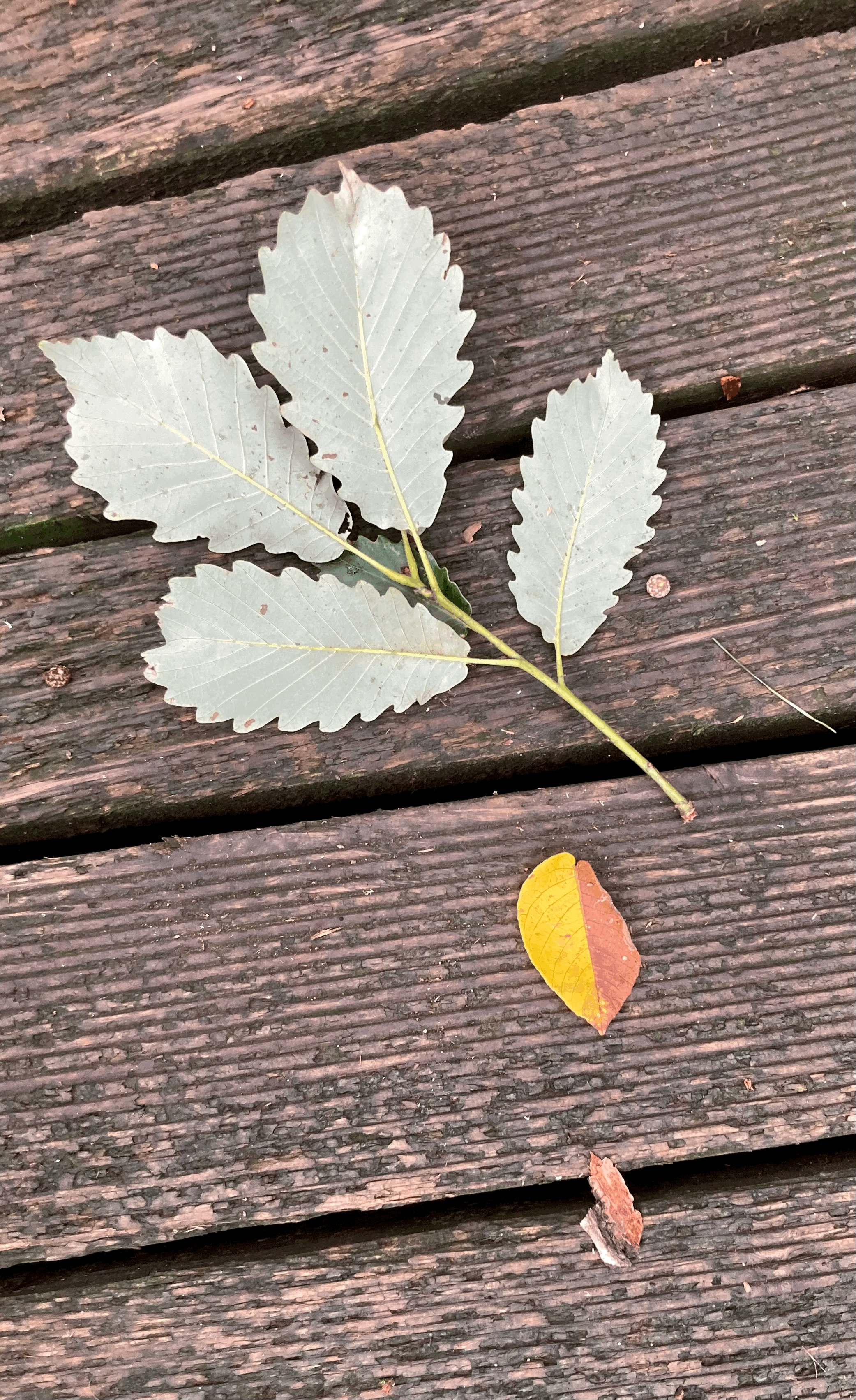 바람이 세게 불거나 비가 내린 다음엔 나뭇잎들이 여기저기 떨어지게 마련인데, 앞 면을 보이는 아이들도 있지만, 뒤집혀 뒷 면을 보이는 아이들도 있다. 개중엔 가을까지 기다리지 못하고 벌써 물이 든 아이들도 있다. 게다가 한 잎이 오른쪽과 왼쪽이 다른 컬러인 것도 심심찮게 볼 수 있다.