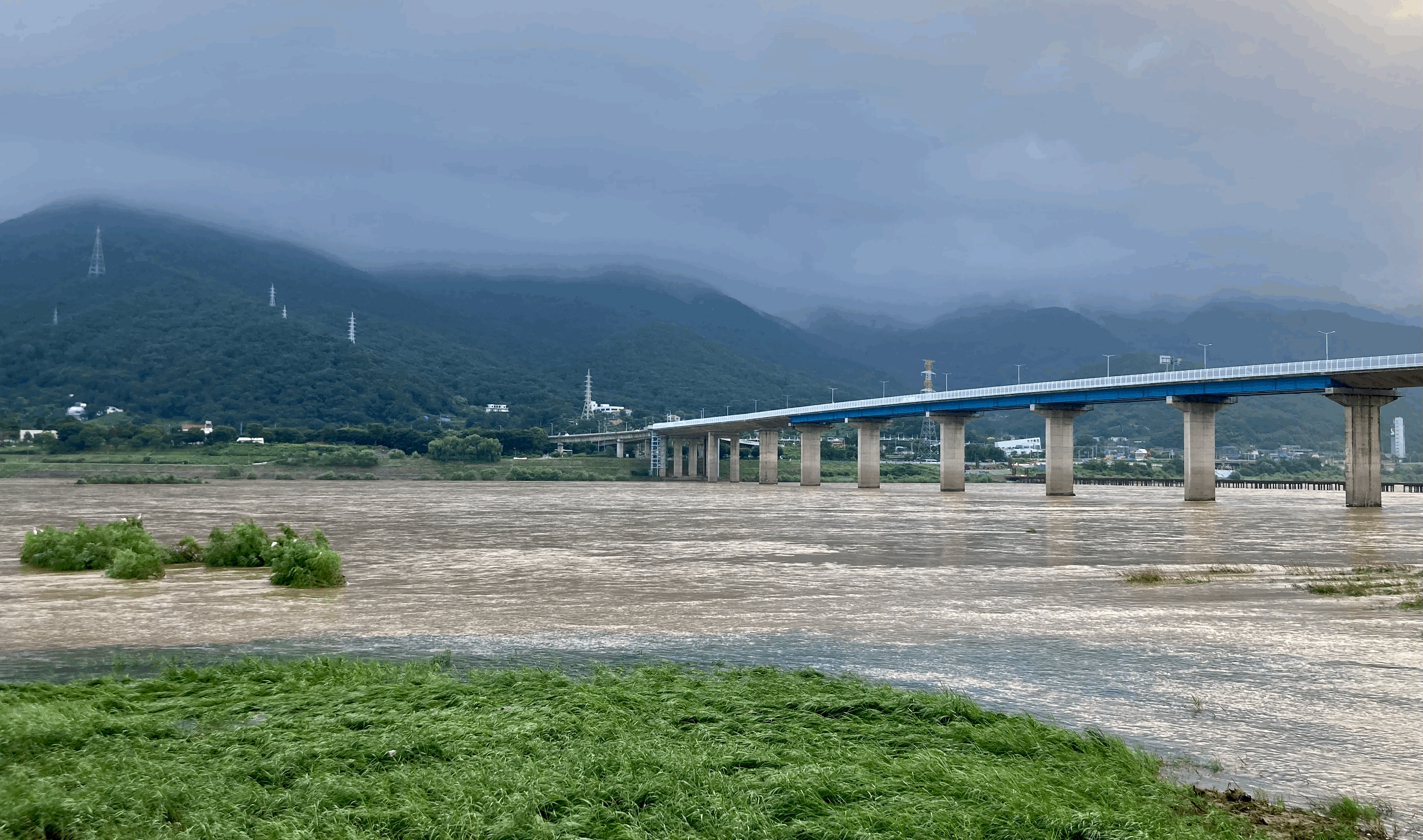 강변에 이르러 철새 관측소에서 바라보니 산곡천 물결은 비교도 안 될 정도로 팔당대교 아래를 흐르는 한강물은 수위가 높아지고 물결이 거세 보였다. 팔당대교 오른쪽에 있는 팔당댐에서 수문을 열어 방류했기(7/31/11) 때문이다. 장마는 지나갔어도, 아직 여름 소나기가 몇 차례 몰려와 산책객들의 발을 묶을지 모르겠다.