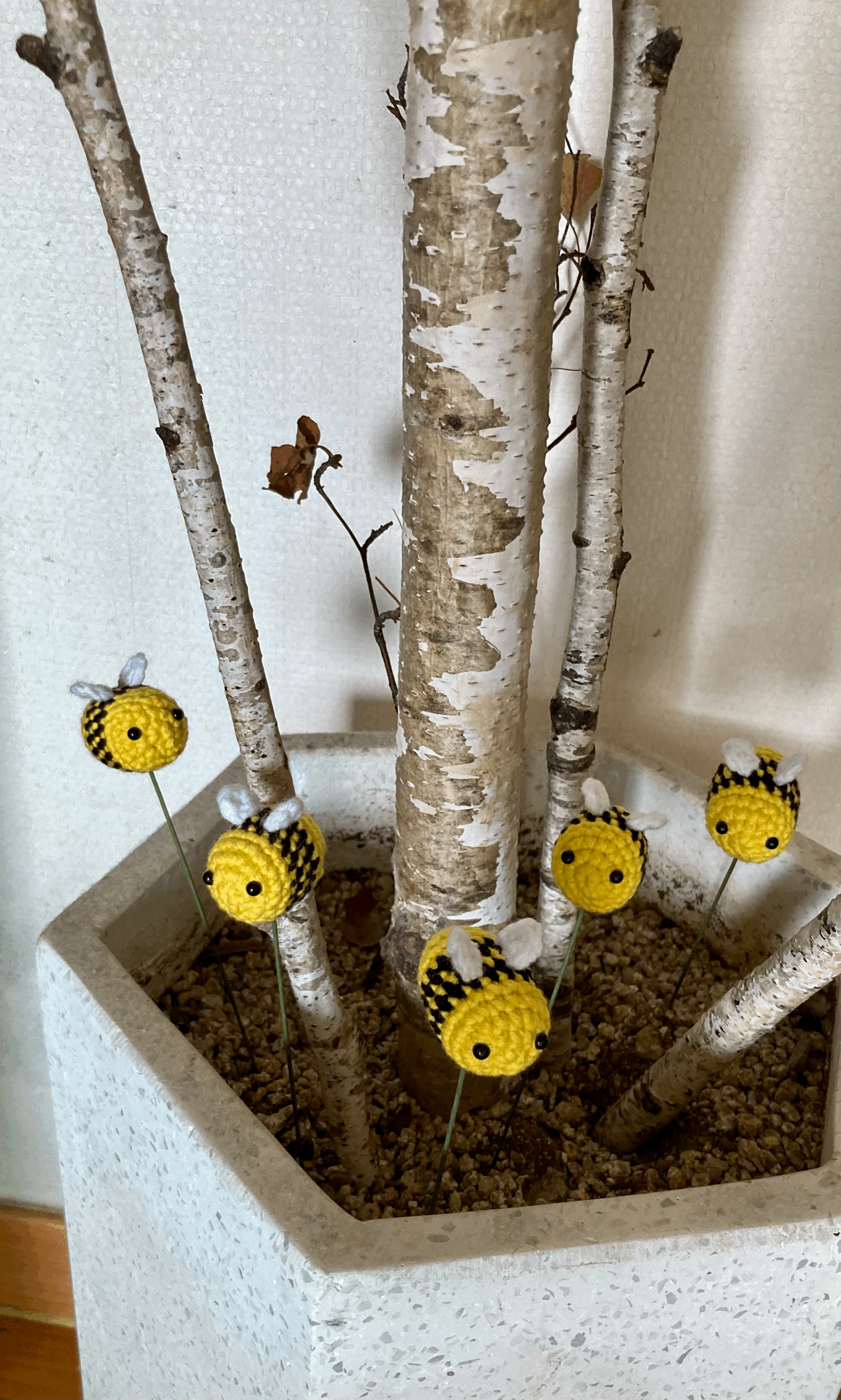 처제가 인스타에 올린 막내 은지의 식물 뜨개를 보고 너무 귀엽다며 다섯 개를 주문했다. 두 주 전에 우리집에 올 때 가져왔는데, 자작나무 화분(1/5/21)에 꽂아 놓으니 노란색 벌들이 방긋 웃는 모양새가 귀엽기 그지없다.