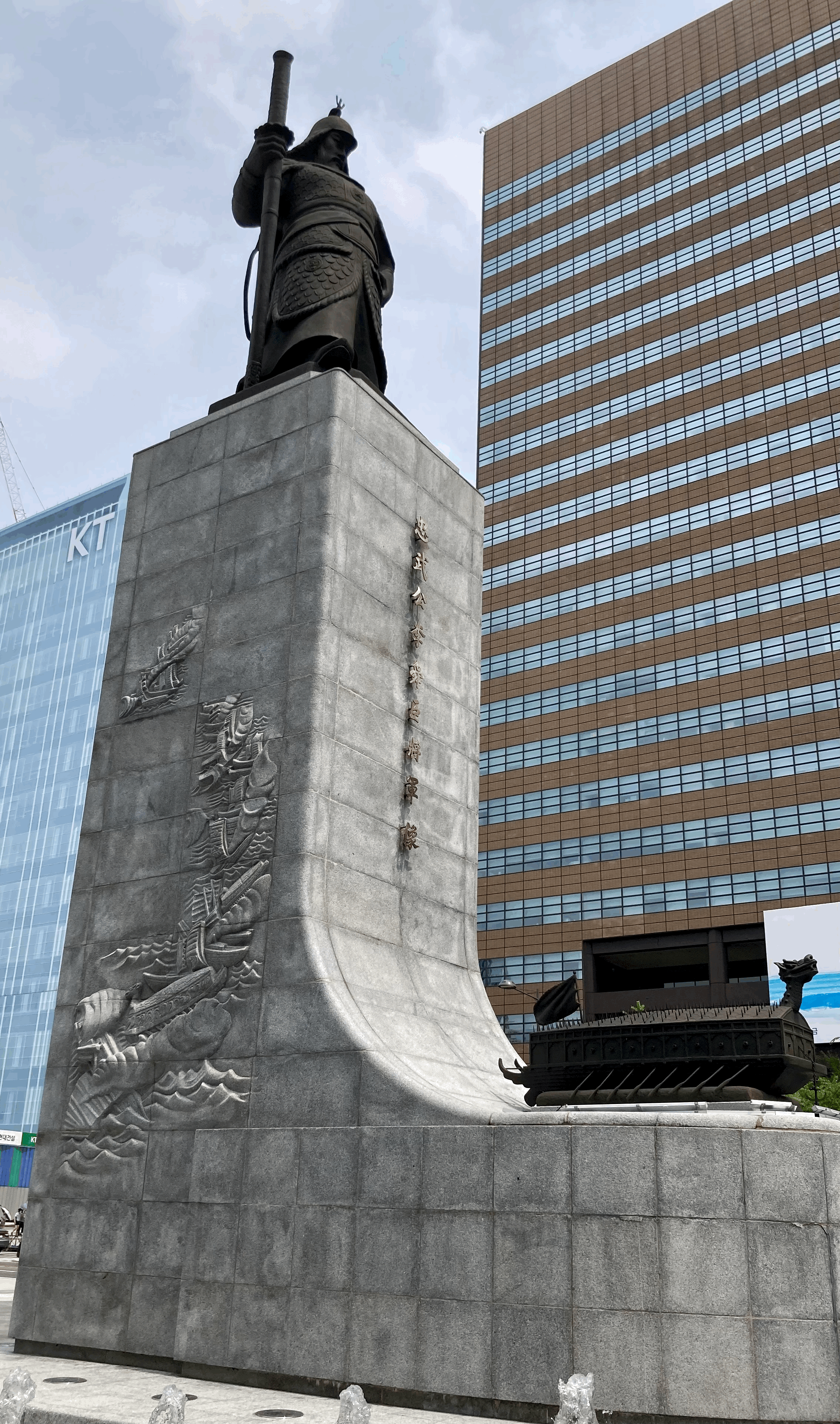 광화문 네거리에서 처음 만나는 건 충무공 동상이다. 칼집을 왼손에 잡고 있어 어색하다는 논란도 있었지만, 어쨌든 광화문을 상징하는 랜드 마크 가운데 하나였다. 전에는 어땠는지 잘 기억나진 않지만, 뒷면도 바로 접근할 수 있도록 개방해 놓았다. 건물이건 작품이건 앞 면만 아니라 뒷 면까지 보면 좀 더 정보를 얻을 수 있다.