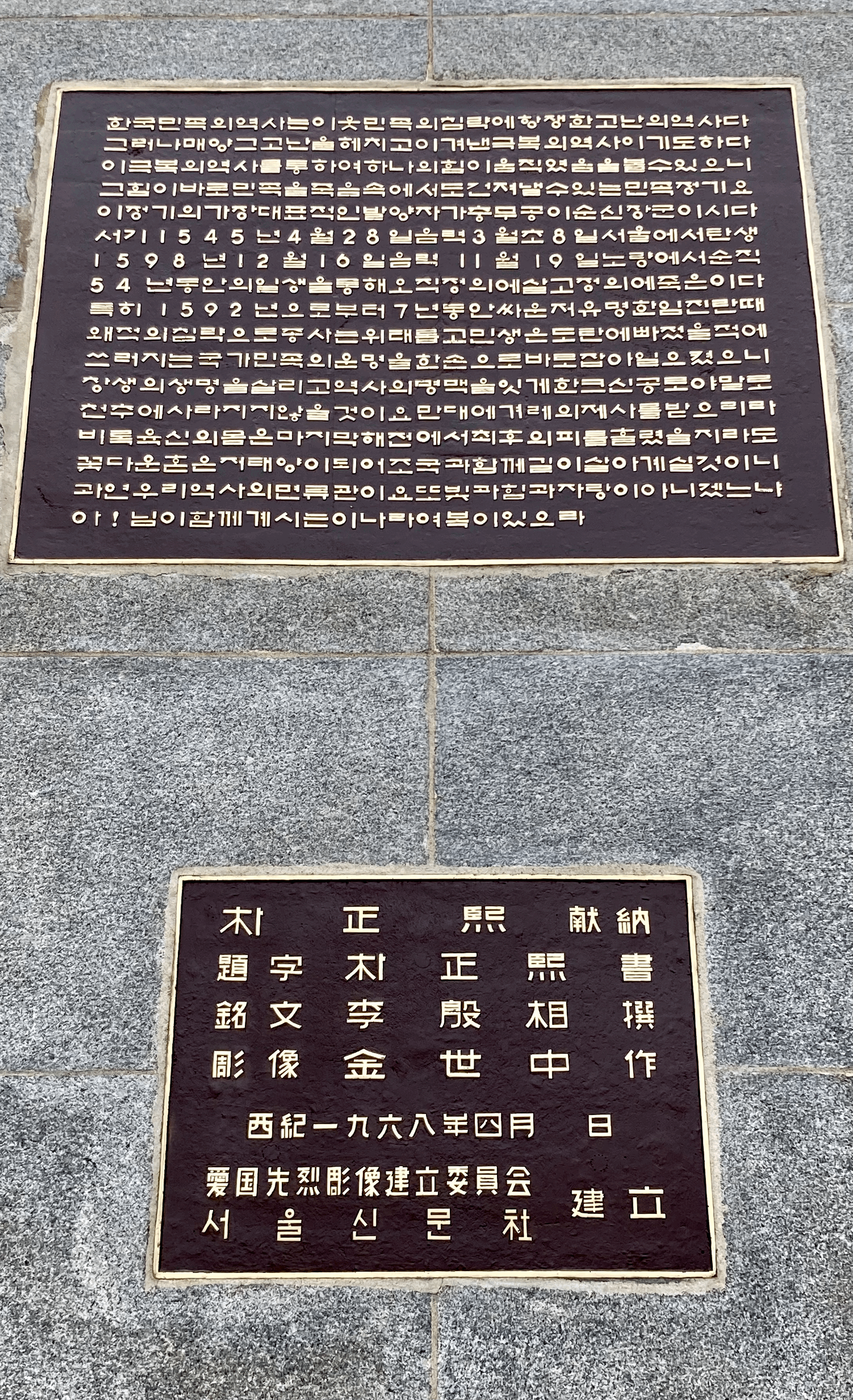 68년에 박정희가 헌납했는데, 이은상과 김세중이 각각 명문을 짓고 청동 동상을 작업했고, 글씨는 박정희가 썼다는 기록이 보인다. 전면의 동상 아래 글씨를 말하는 건지, 뒷면의 제작기를 말하는 건지 불분명해 보이지만, 어쨌든 과거 통치자들은 이렇게 근사한 데에 자기 이름을 남기고 싶어 했던 건 확실하게 알겠다.