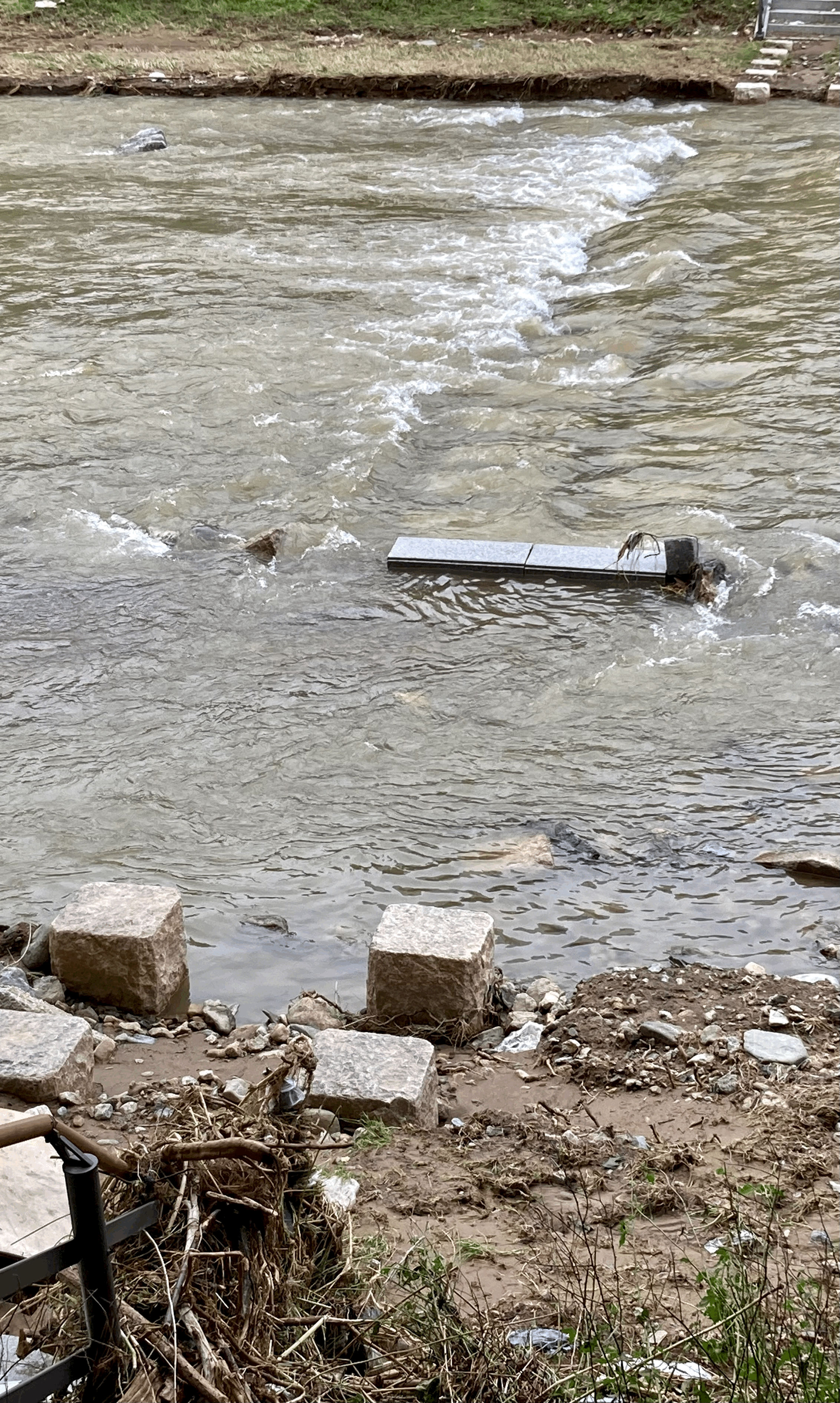 검단산 계곡에서 발원해 팔당대교 아래 한강에 이르는 물줄기인데, 평소엔 잔잔하고 맑아서 보기도 좋고, 왜가리(8/26/21)와 오리떼도 놀러오고, 아이들도 잠자리 잡으면서 발을 담그는데, 이번처럼 큰 비가 내리면 위험해 며칠씩 통제되곤 한다.
