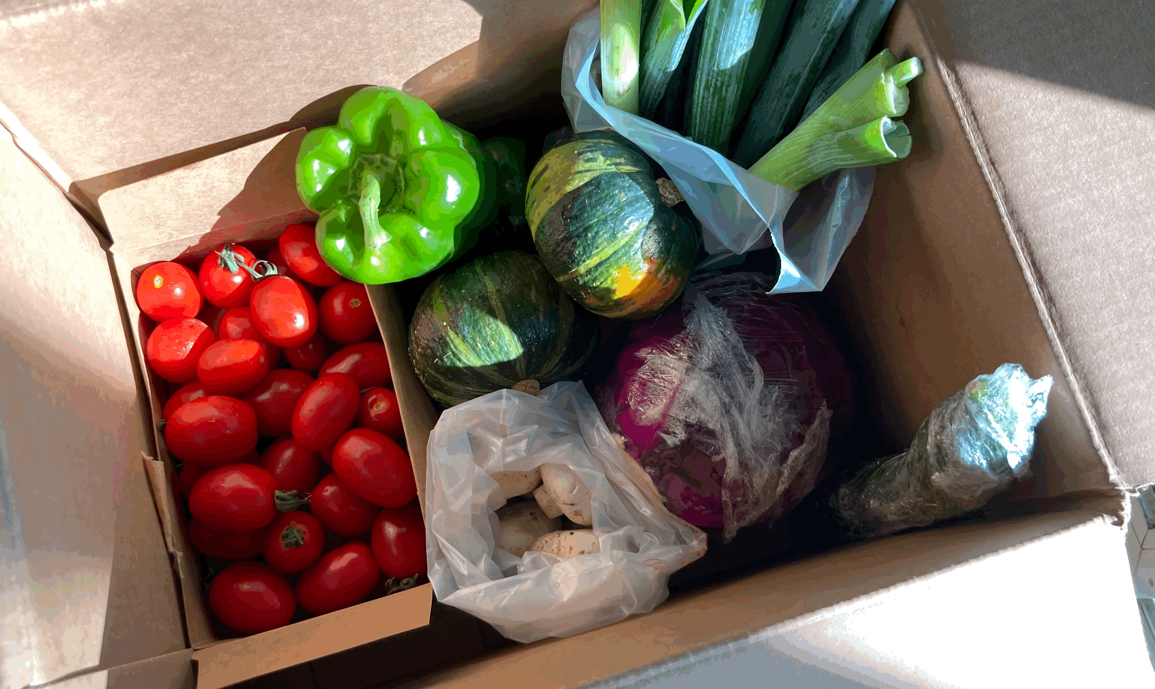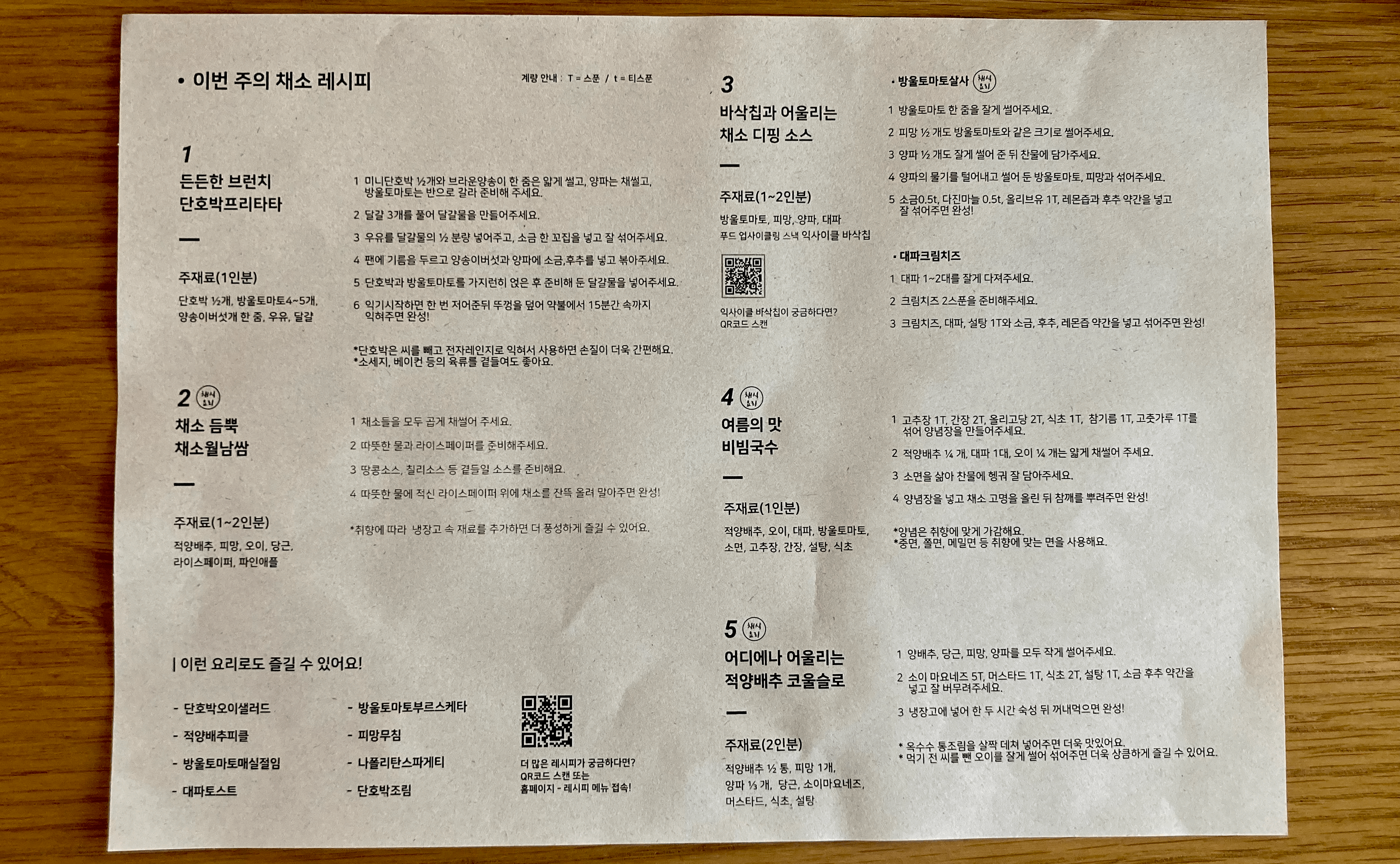 g가 주문한 못난이 채소 박스가 배달됐다. 어글리를 자처하지만 신선하고 생생해 보인다. 방울 토마토와 양송이는 반 상자쯤, 대파는 다듬어서 반으로 잘라서, 적양배추·단호박·오이·피망 등이 한두 개씩, 바삭칩도 한 봉 들어 있어 먹기 좋고 보관하기도 좋은 구성이다. 산지 표시와 배송된 채소로 해 먹을 수 있는 간단한 레시피 용지도 들어 있다.