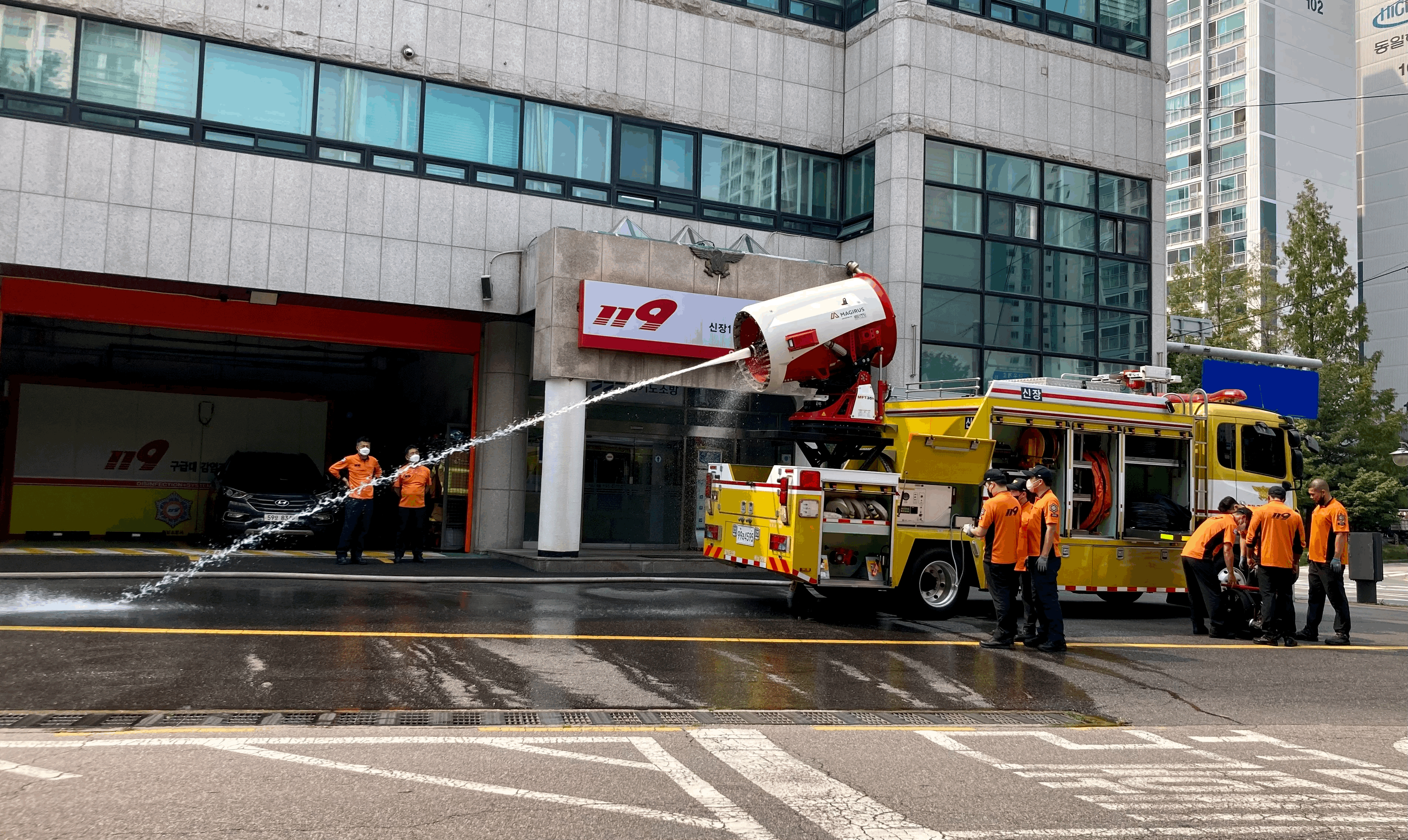 소방차는 대체로 빨간색이지만 개중엔 노란색 소방차도 보인다. 뭔가 다른 기능을 수행하길래 컬러를 다르게 했을 것이다. 마침 며칠 전 트레이더스 가다가 정차 신호를 받고 서 있는데 훈련 상황이 전개되고 있었다.