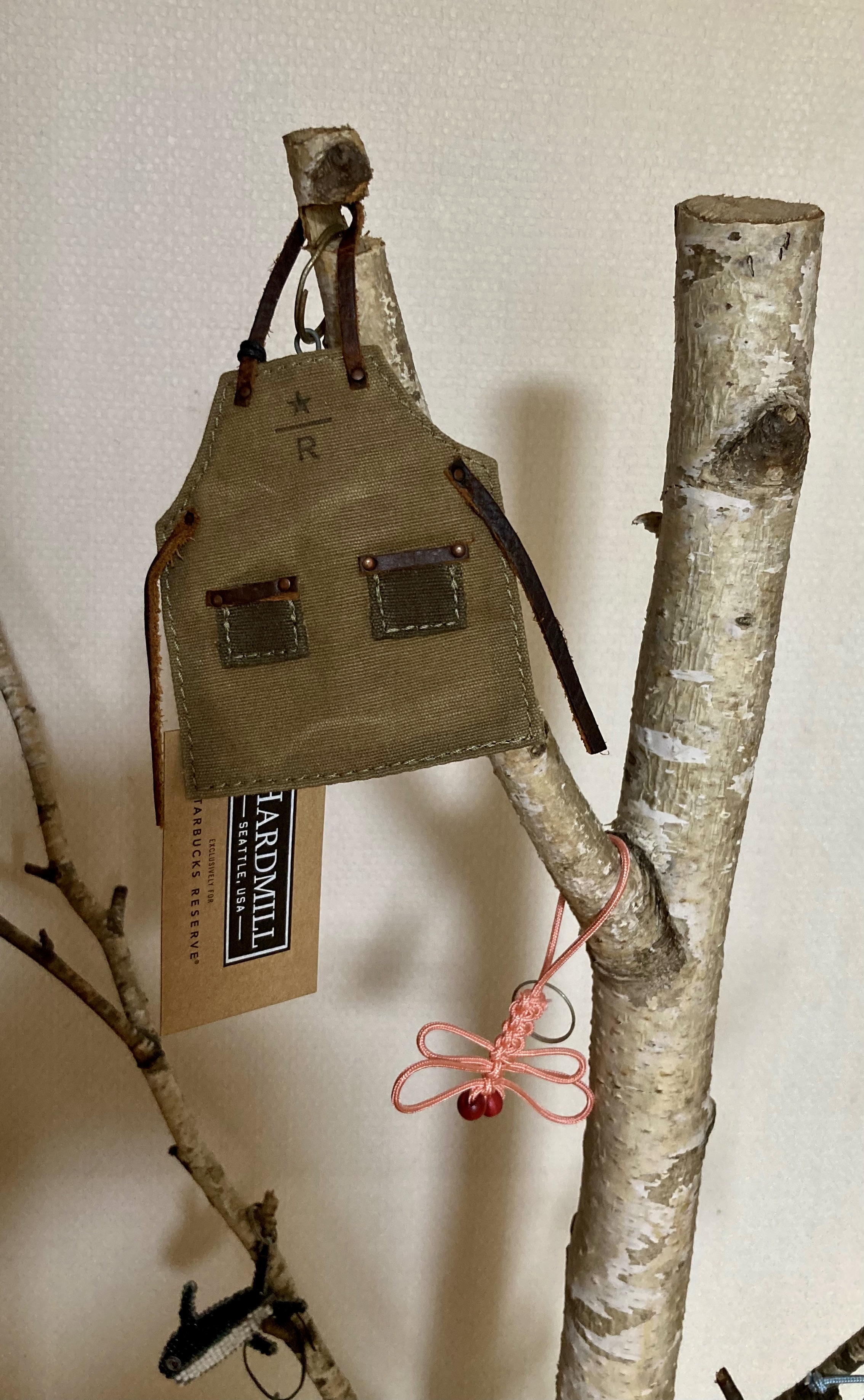 여름에 미국 코스타에 갔다가 뉴욕에 들린 larirari님은 접시(7/29/22)와 함께 스타벅스 한정 미니 앞치마 장식물도 건네주었다. 거실 책꽂이 옆 자작나무 가지에 걸어놓으니 아주 잘 어울린다. 그런데 앙증맞은 미니어처라서 망정이지, 실물 크기였다면 늘 걸치고 노동깨나 하게 만들 것 같다.^^