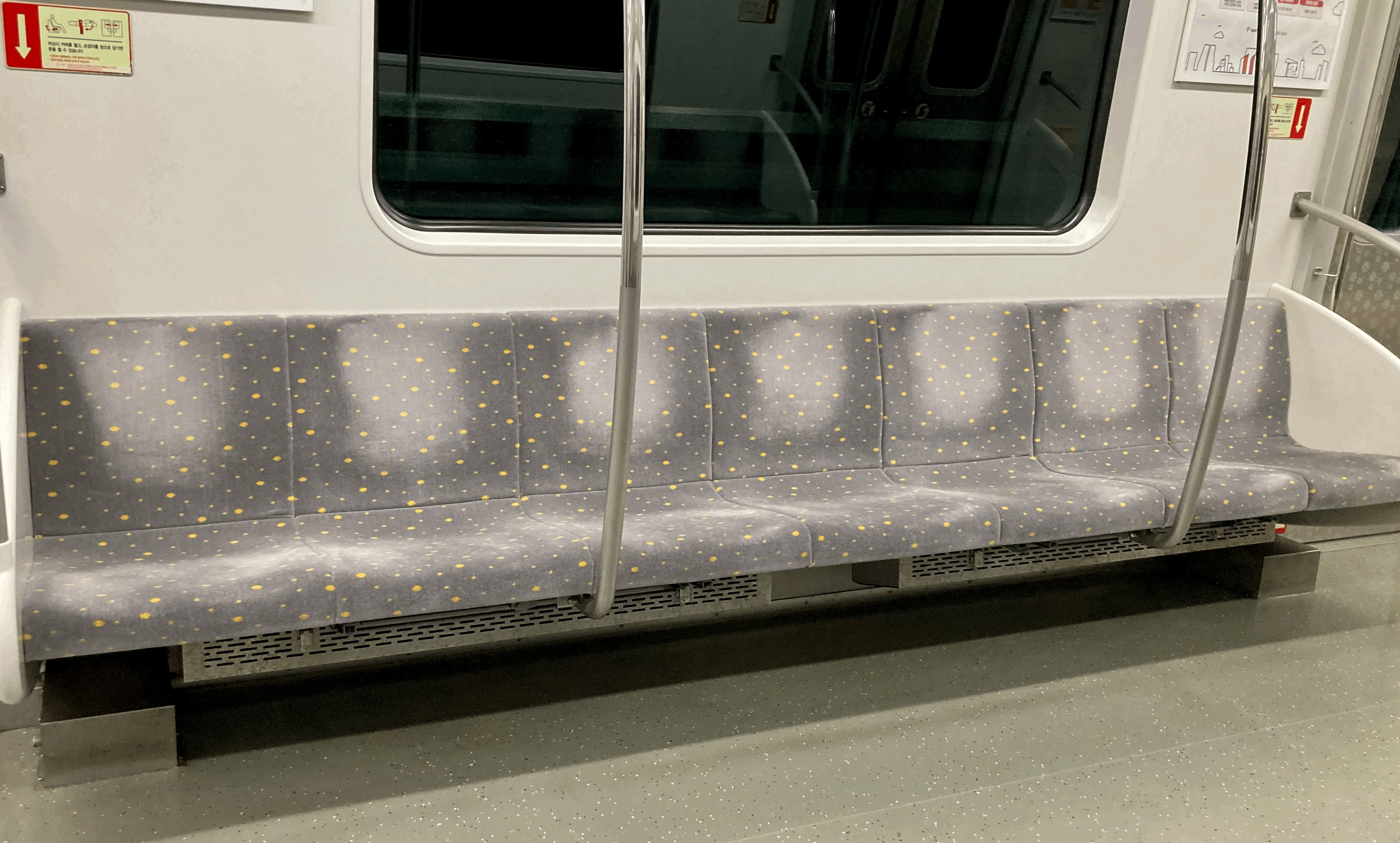 송파에 갈 때 종종 타는 9호선도 생긴 지 얼마 안돼 쾌적한 편이지만, 7석 배열이다. 좌석 시트 천의 앉는 부분과 기대는 부분이 닳아 있는 게 얼마나 많은 이들이 의자에 앉고 일어서는지 보여준다. 7석이건 6석이건 자리가 나서 앉게 되는 것만으로도 감지덕지다.