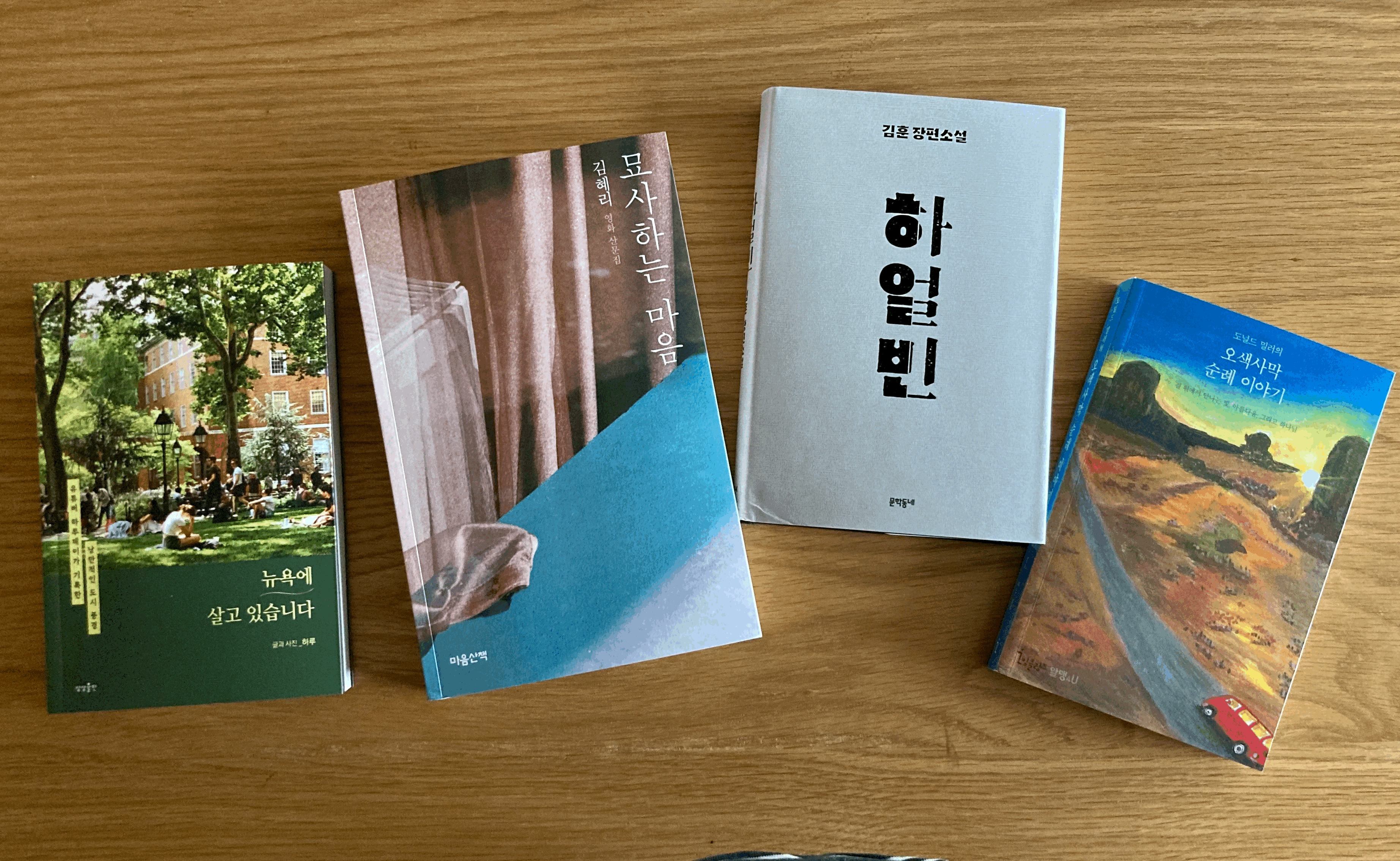 아내가 즐겨보는 뉴욕 유튜버가 낸 책, g가 좋아하는(우리도 좋아한다) 영화 기자가 몇 년간 쓴 칼럼을 모은 책, 당대의 문장가/소설가의 오랜만의 신간, 그리고 후배가 차린 출판사에서 나온 신간 한 권을 주문했다.