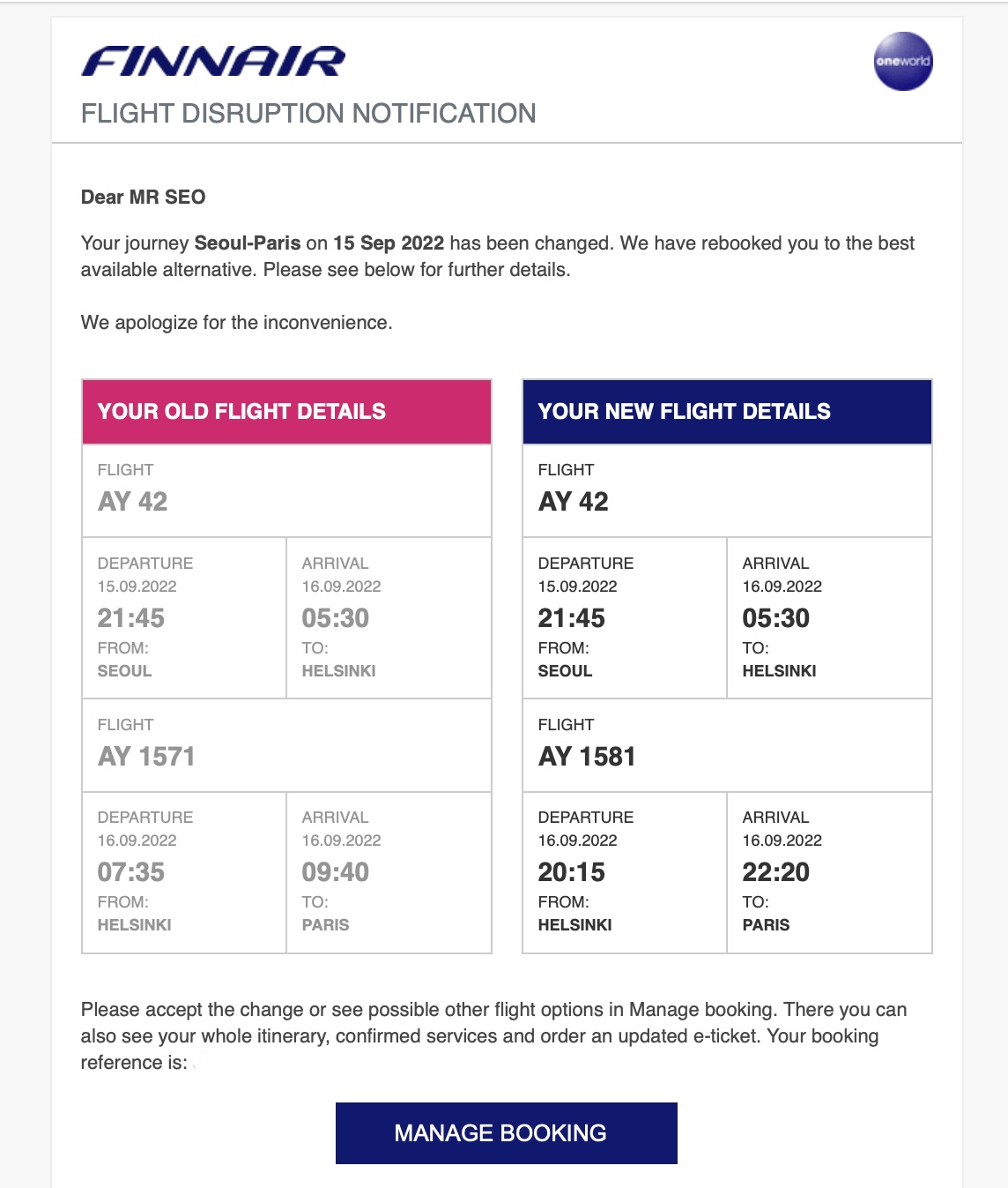 다행히 몇 시간 지나 대체 항공편 안내 메시지가 왔는데, 허걱! 헬싱키에서 2시간 경유하려던 게 15시간으로 크게 늘어나 밤 늦게 파리에 도착하는 비행 편이었다. 어쩌랴! 이 방법밖에 없다는데. 파리 첫날 일정은 허무하게 날려보내야 했지만, 그나마 하루 이틀 뒤에 연결되거나 아예 여행을 접는 최악은 면했으니 말이다.