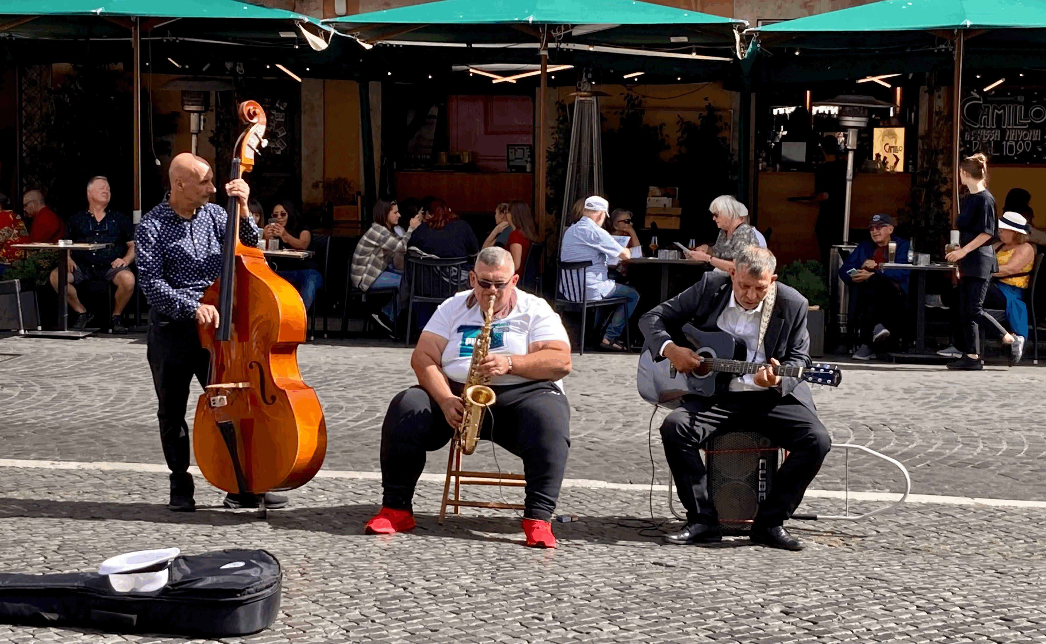 로마 판테온에서 가까운 나보나 광장에선 색소폰 연주가 돋보이는 트리오가 햇볕이 내려쬐는 가운데 쉼없이 연주를 하고 있었다. 3인조 악단인데, 가운데 색소포니스트가 음악의 중심을 잡고 쉬지 않고 연주를 계속했다.