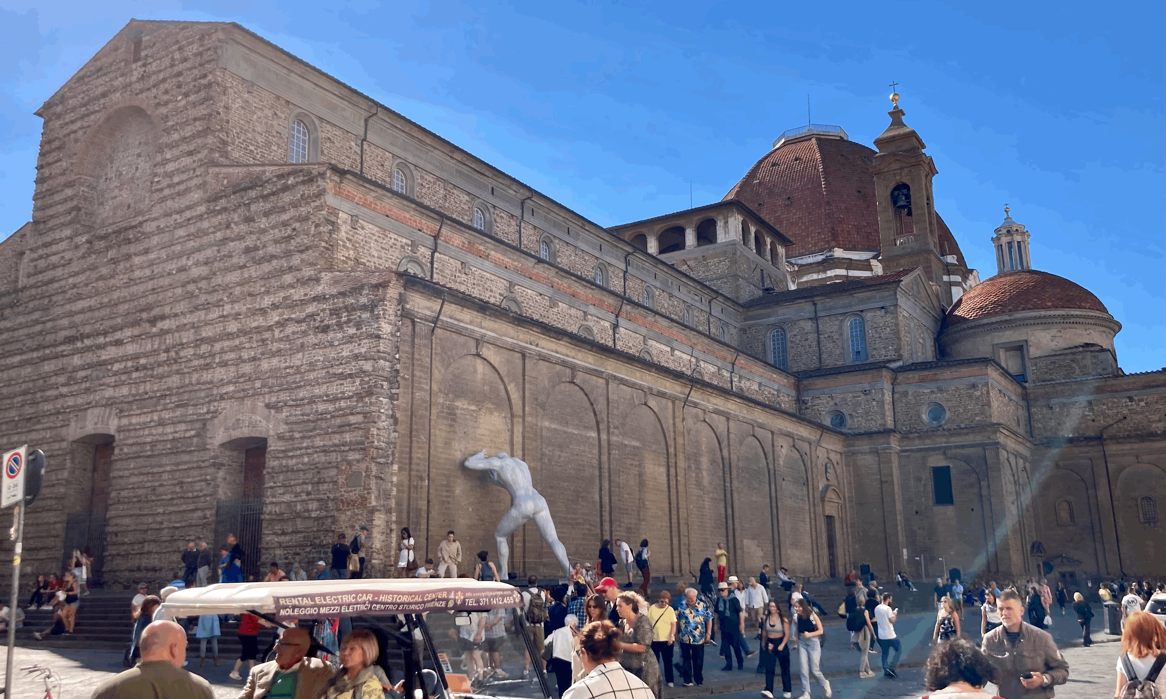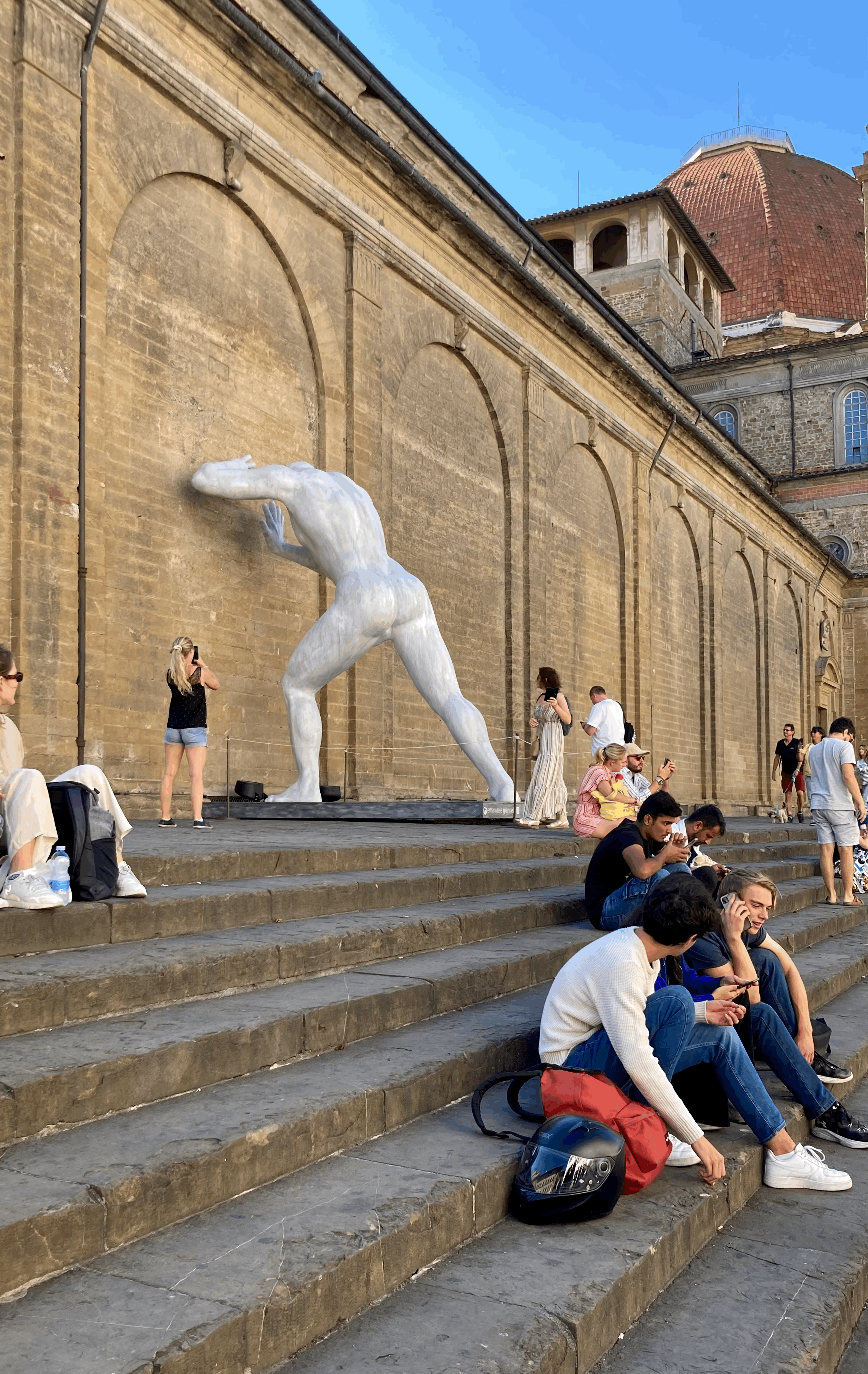 피렌체 중앙시장 가는 길 산 로렌조 대성당 앞에 성당을 떠미는 듯한 포즈의 커다란 조각 작품 하나가 서 있다. 엠마누엘레 지아넬리(Emanuele Giannelli)의 <Mr. Arbitrium>이란 2021년 작품인데, 이 특이한 포즈를 흉내내는 이들이 여럿이다.