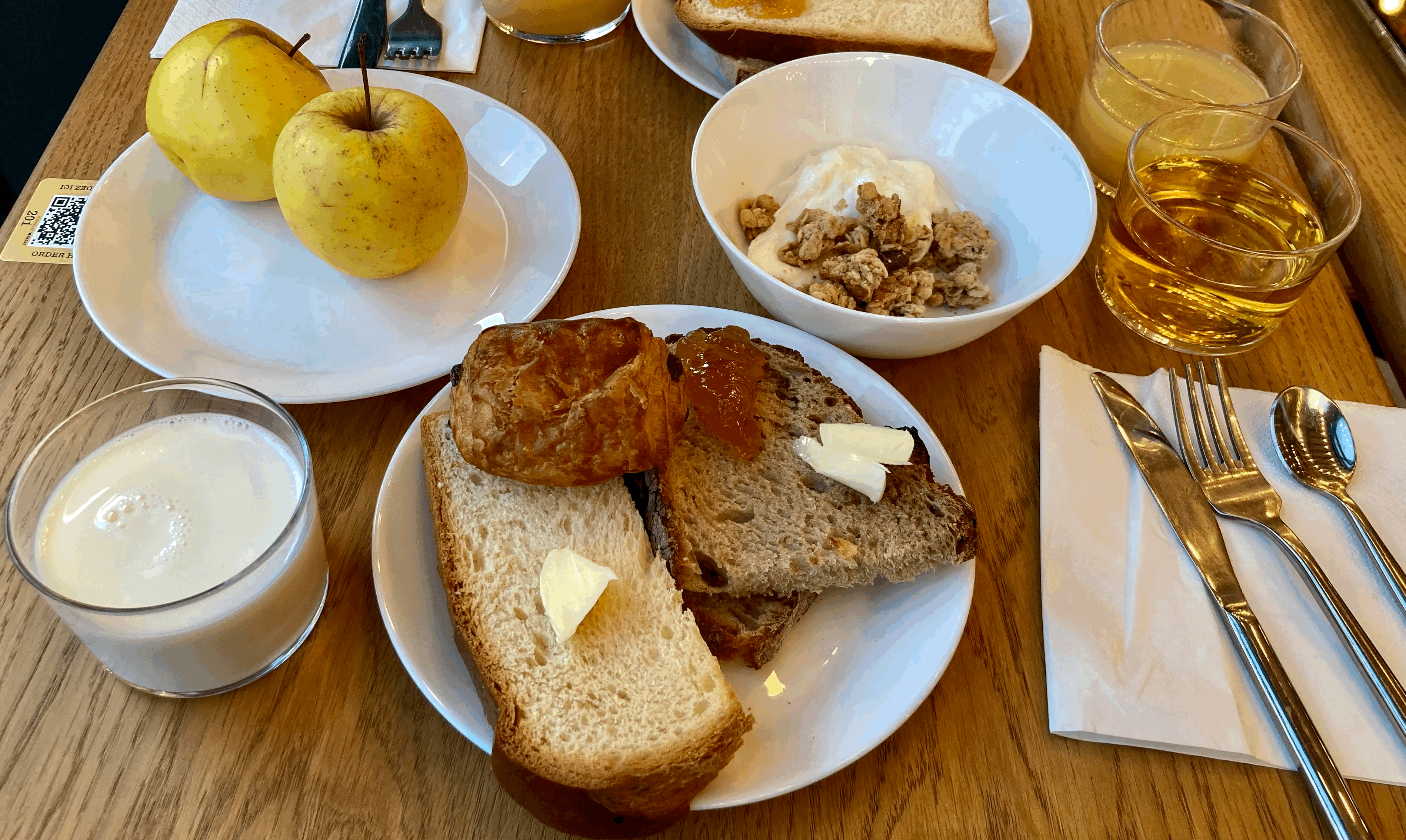 심지어 호텔에서 7유로씩 주고 먹은 조식도 빵이 맛있으니까 다 맛이 상승하는 것 같았다. 식빵과 크라상만으로 단출했지만, 쥬스, 커피와 함께 아침을 든든히 시작하게 해 주었다. 아, 빵은 아니지만, 파리의 노란 사과도 한 맛 했다.