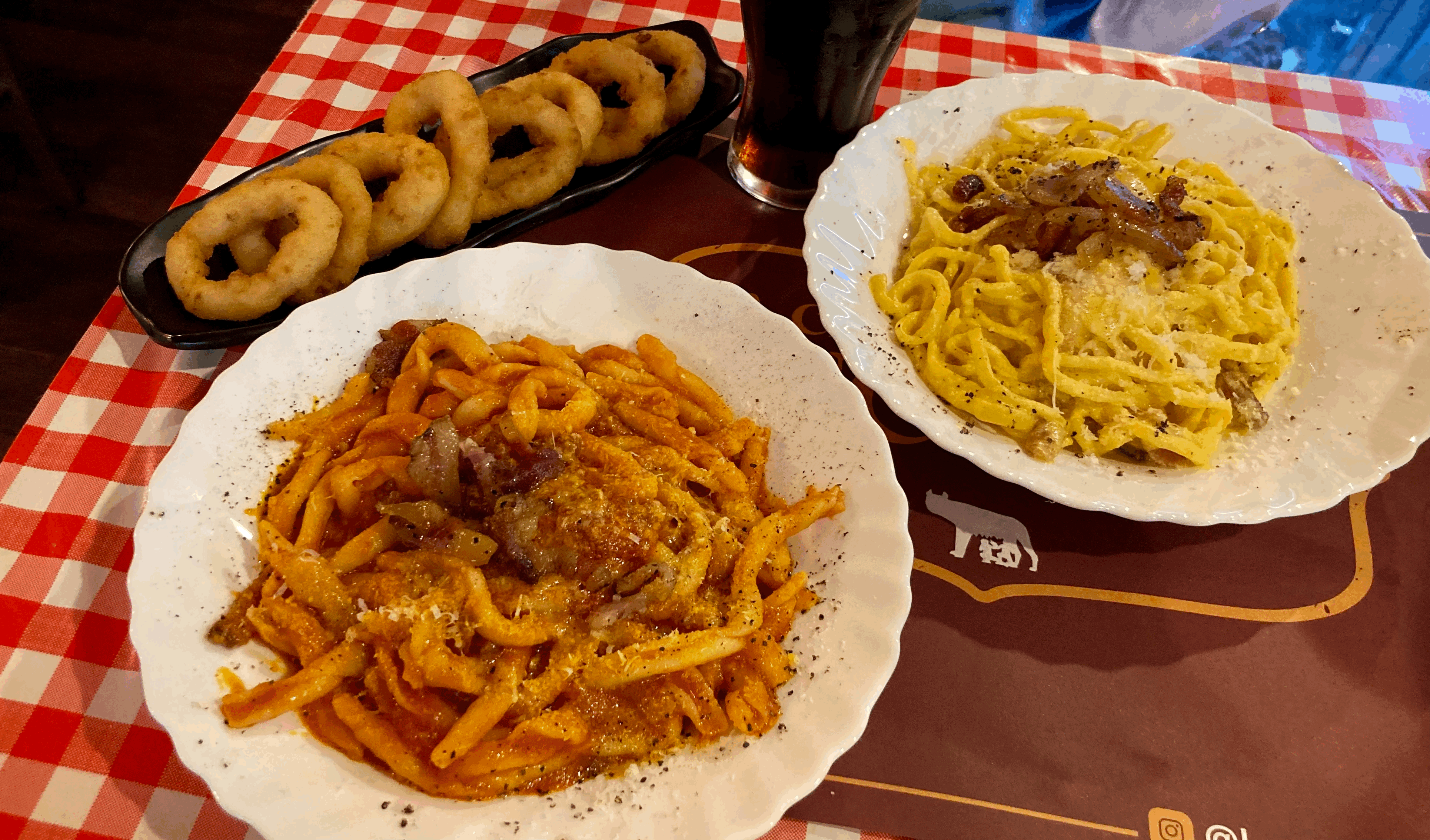 포로 로마노와 팔라티노 언덕을 구경할 때 비가 조금 내렸다. 시장하기도 하고 비도 피할 겸 해서 가까운 파스타 맛집 루꿀로(La Casa Di Lucullo)를 찾았다. 유명한 집은 아니고, 동네 맛집 정도의 작은 식당이었다. 까르보나라와 토마토 파스타, 양파 튀김을 하나씩 시켰다.