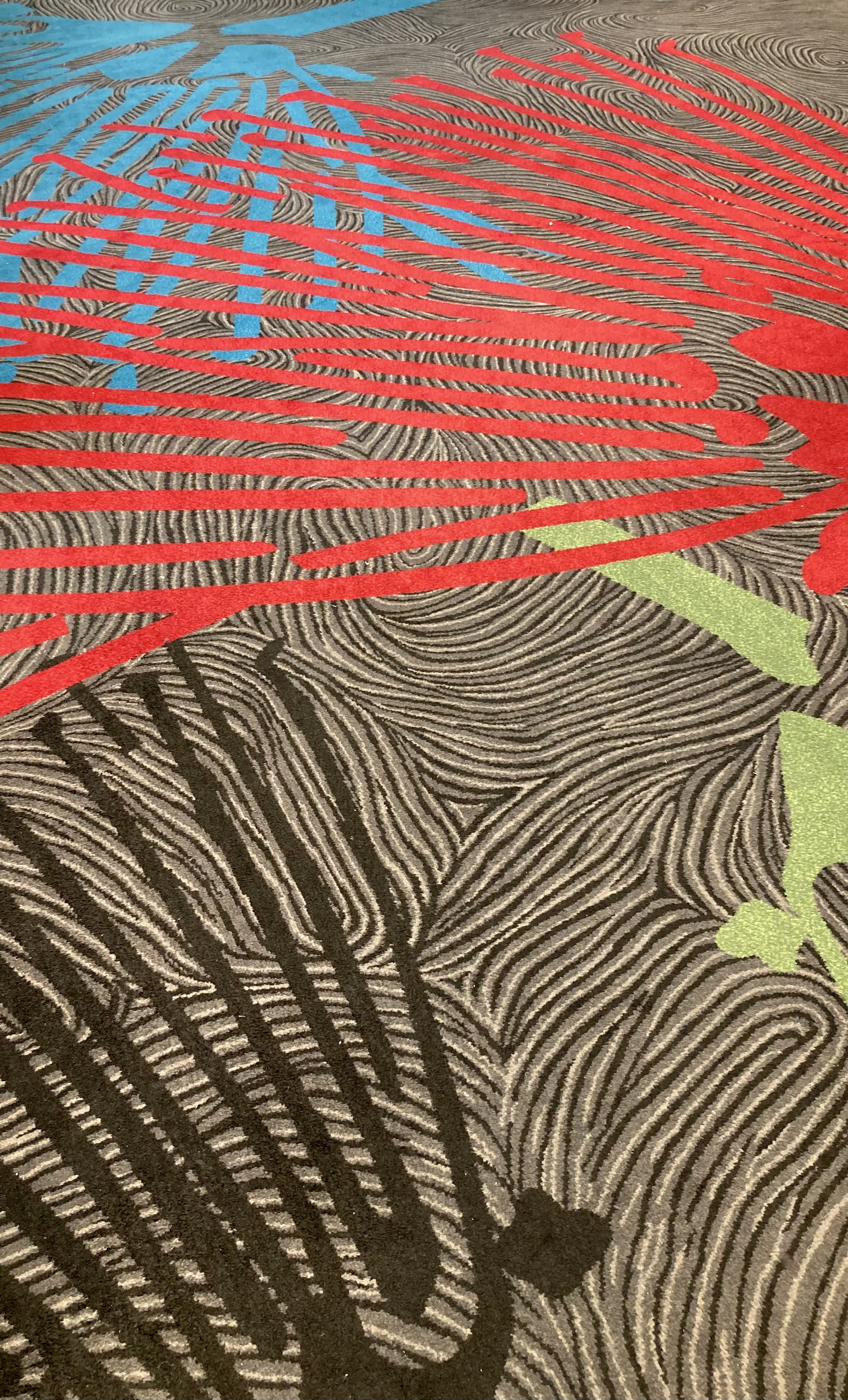 공항마다 탑승 게이트들 앞에 의자가 놓여 있고, 카페트 깔린 데가 많다. 뉴질랜드 오클랜드 공항 바닥엔 커다란 새의 날개나 식물의 잎처럼 생긴 무늬가 새겨 있는데, 어떻게 보면 신화적 분위기까지 풍긴다. 블랙을 기본으로 레드, 블루, 그린 컬러가 선명하고 강렬한 인상을 주는 게 라이언 킹 류의 아프리카 느낌을 주기도 한다.