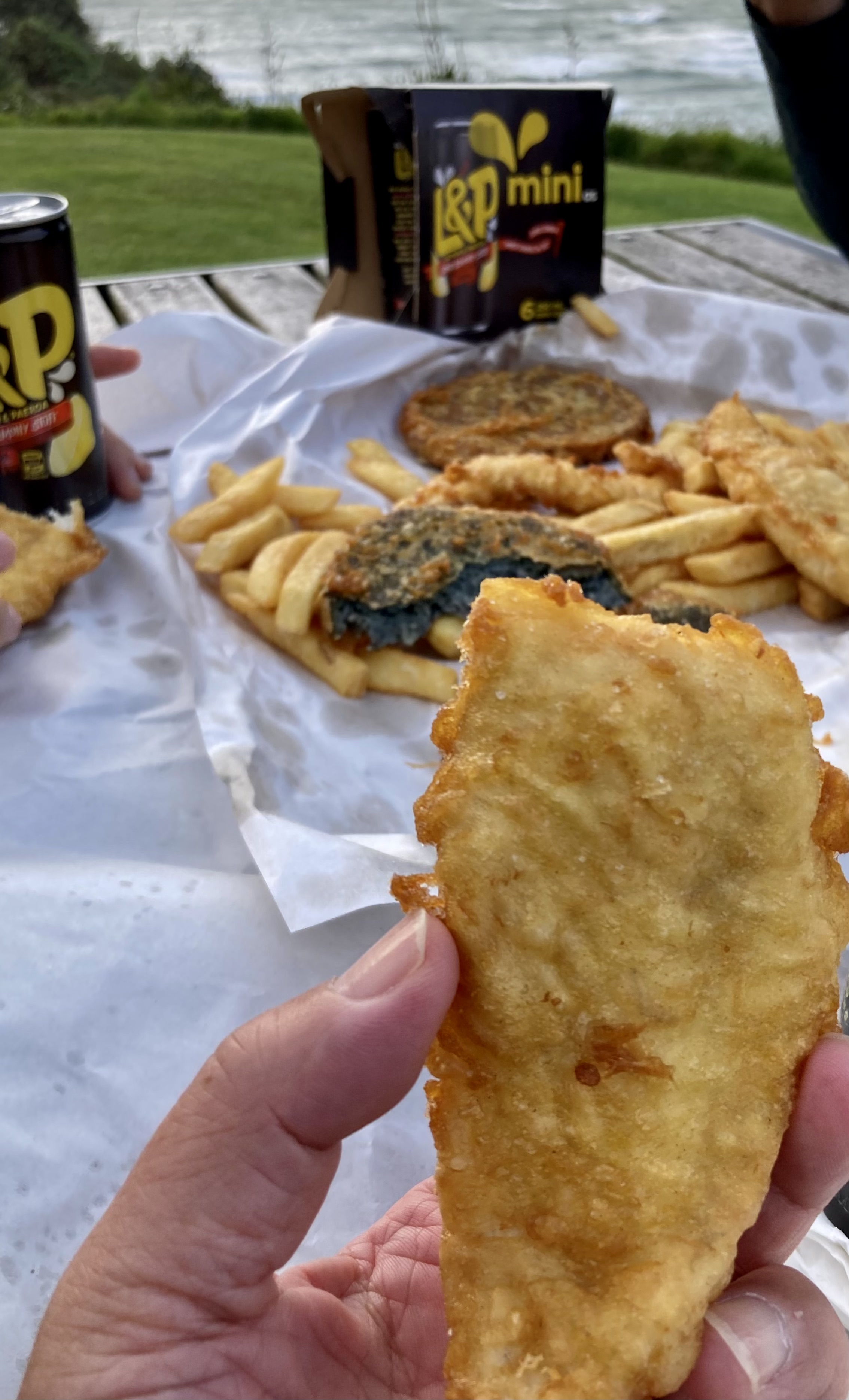 피쉬 앤 칩스에 이곳 청량음료 L&P(Lemon & Paeroa)가 빠질 수 없다. 파에로아는 와이카토에 있는 마을이라니, 그야말로 로컬 음료를 마시는 셈이다. 갈매기 비슷한 새가 음식 냄새를 맡고 주위를 선회헸지만, 미안! 너무 맛있어서 이번엔 줄 게 없어.