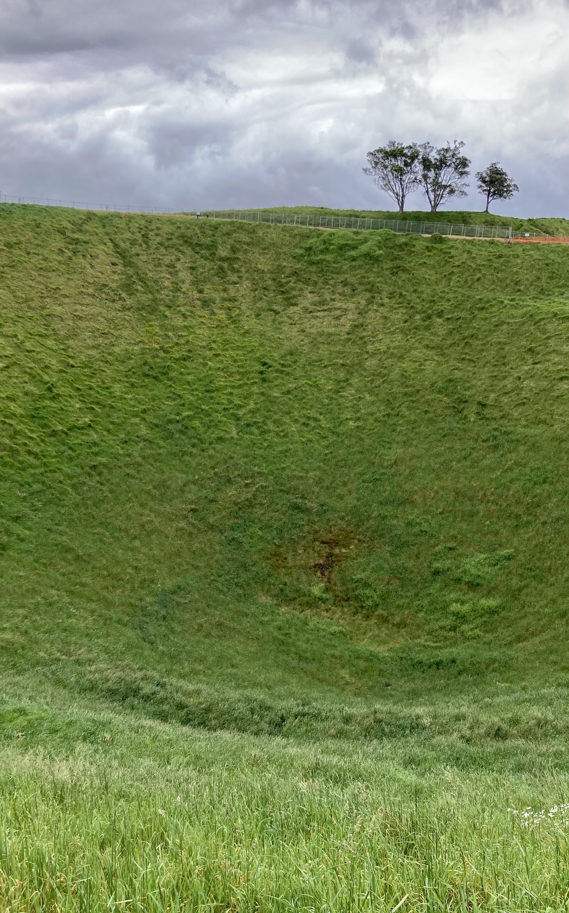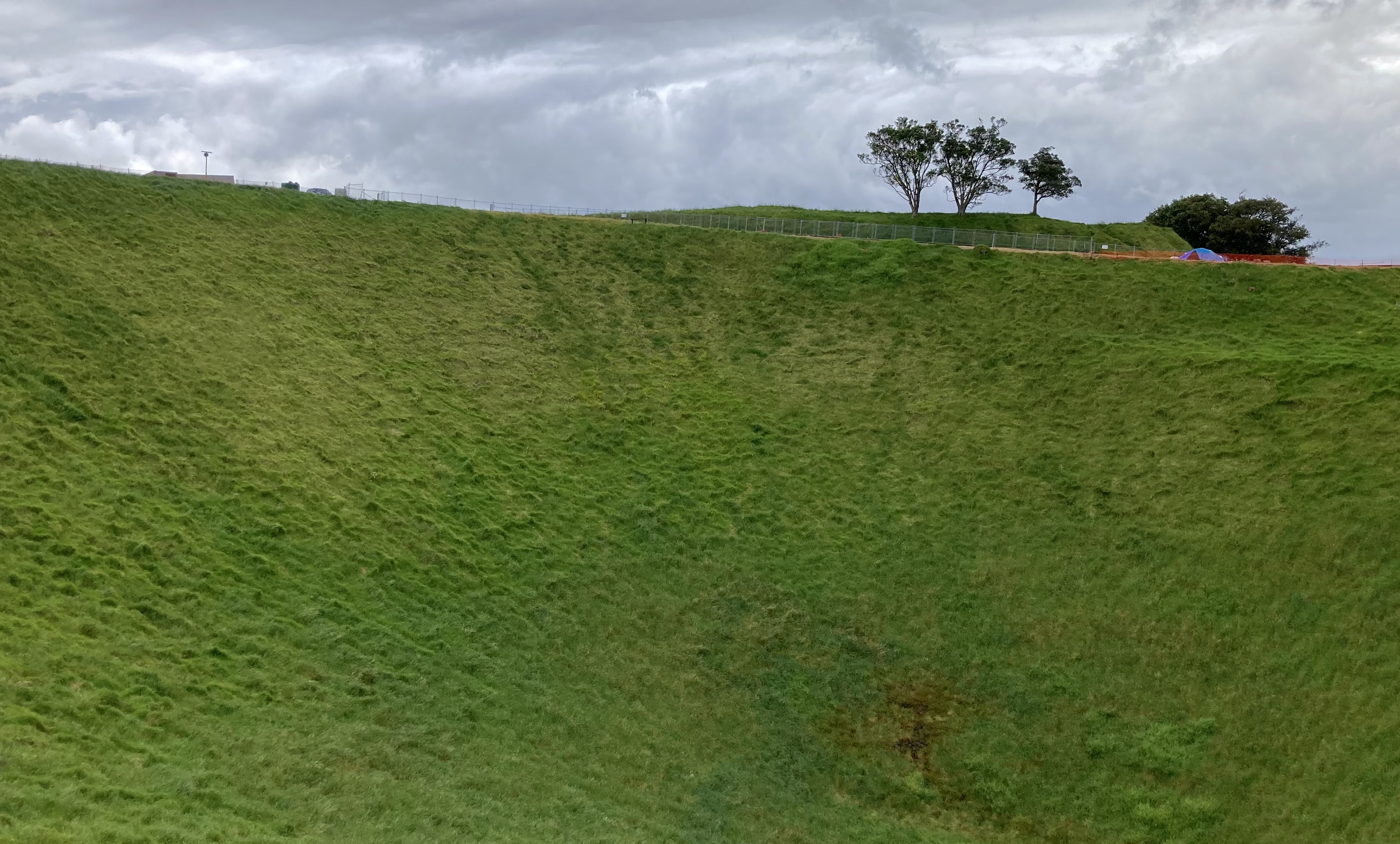 흐리고 비가 조금 뿌려대는 날씨였지만, 나즈막한 언덕을 올라가기에는 별 문제가 없었다. 윈도우 바탕 화면 같은 풍경이 펼쳐져 가로로 한 번, 세로로 한 번 찍었다. 중간에 움푹 파인 데가 있었는데, 사진으로는 가늠이 잘 안 되지만 보기보다 깊었다.