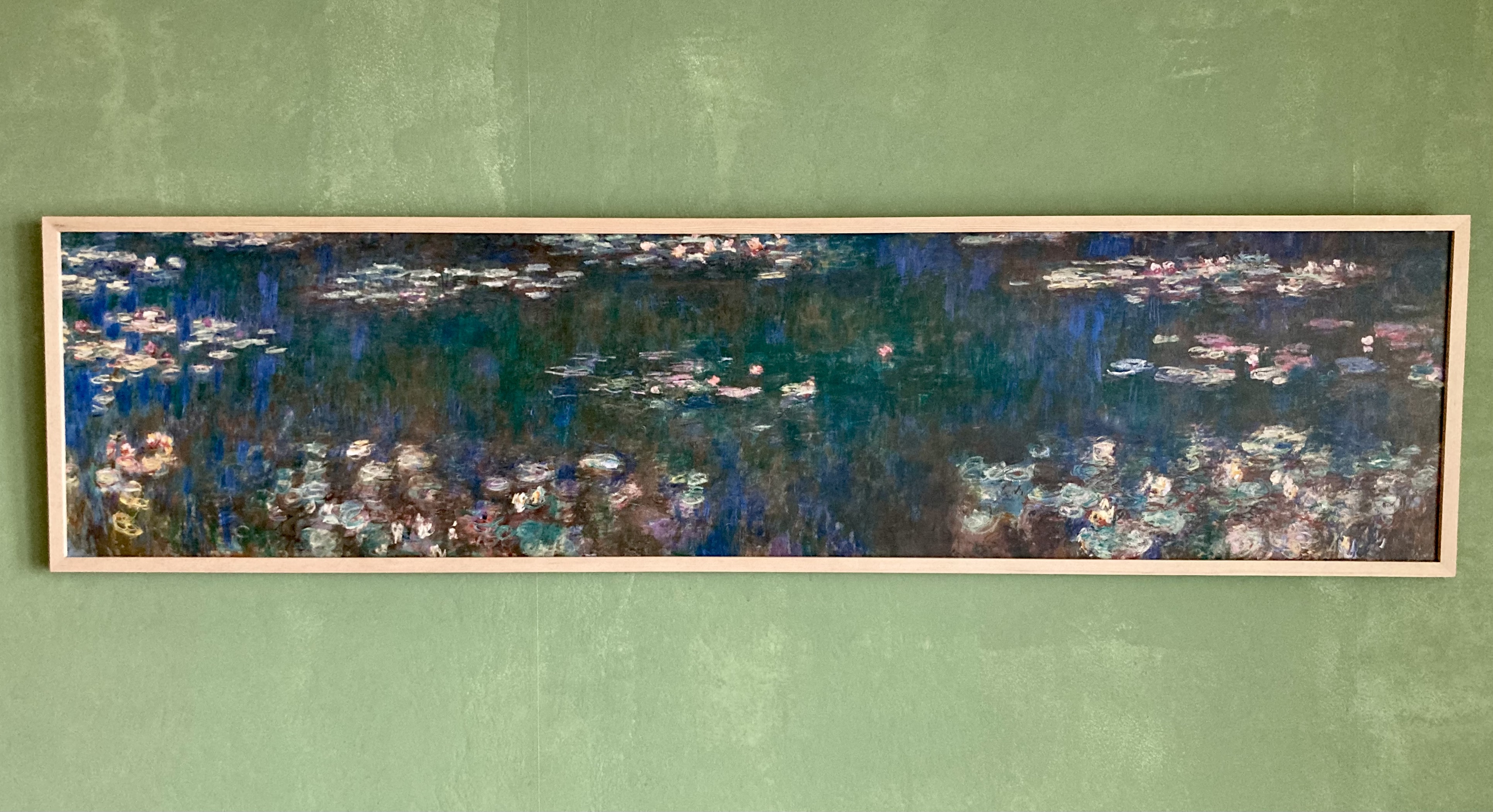 9월에 유럽여행 갔을 때 파리 오랑주리 미술관(11/9/22)에서 모네의 <수련> 포스터를 하나 사 왔다. 너댓 종 가운데 조금 진한 컬러가 인상적이었는데, 아내가 고른 작품이다. 원작처럼 가로가 긴데, 둘둘 말린 채로 한 달 넘게 두었다가 더 이상 미룰 수 없어 송파에 있는 화방에 가지고 가서 액자를 만들었다.