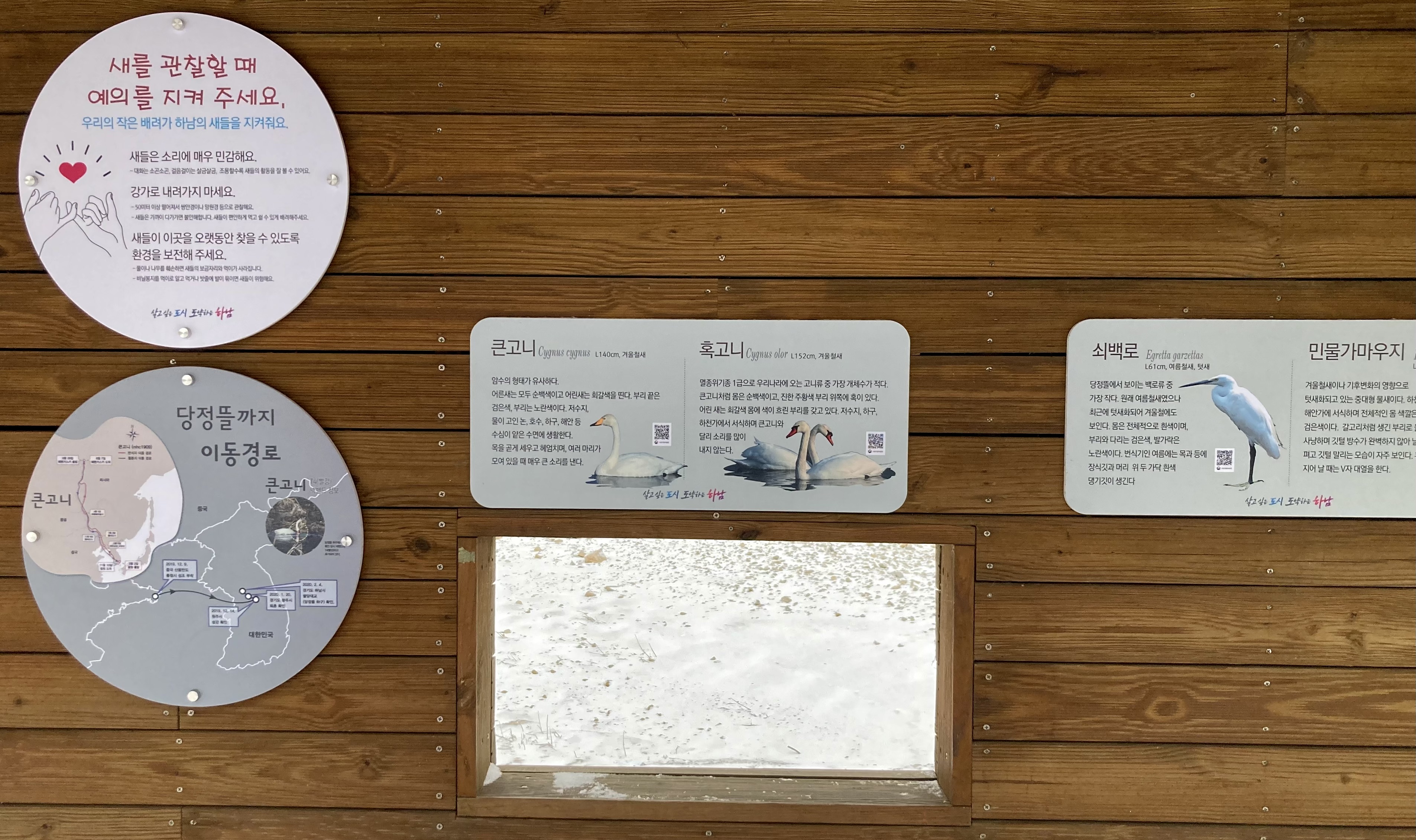 얼마 전에 이 강변에 날아오는 철새들에 대한 안내판도 새 단장을 했는데, 제법 많은 철새들이 방문하는 가운데 특히 큰고니들과 청둥오리들이 많이 날아오는 것 같다. 이들의 이동경로를 지도에 표시해 놓았는데, 시베리아에서부터 저 먼 길을 날아왔으니 철퍼덕 주저앉아 쉬는 것도 이해가 된다.^^
