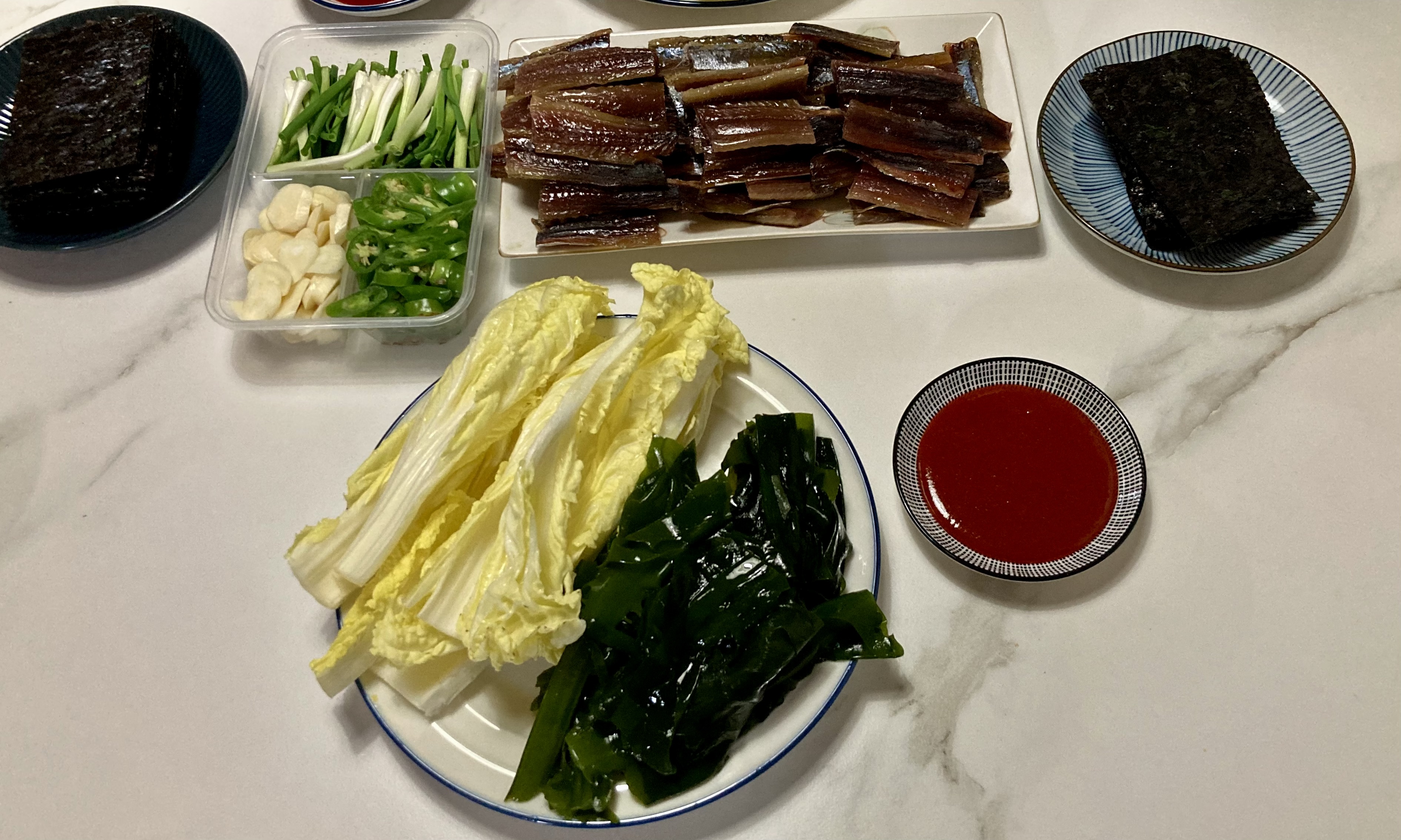 g가 크리스마스에 먹으려고 과메기를 주문했다. 쌈까지 함께 주문하니 쌈배추, 물미역에 김까지 함께 왔다. 쪽파에 마늘, 청양고추가 단정하게 썰려 왔고, 초고추장까지 모두 7종이 들어 있었다. 과메기만 잘라 놓으면 바로 먹을 수 있도록 정갈하게 포장돼 있었다.