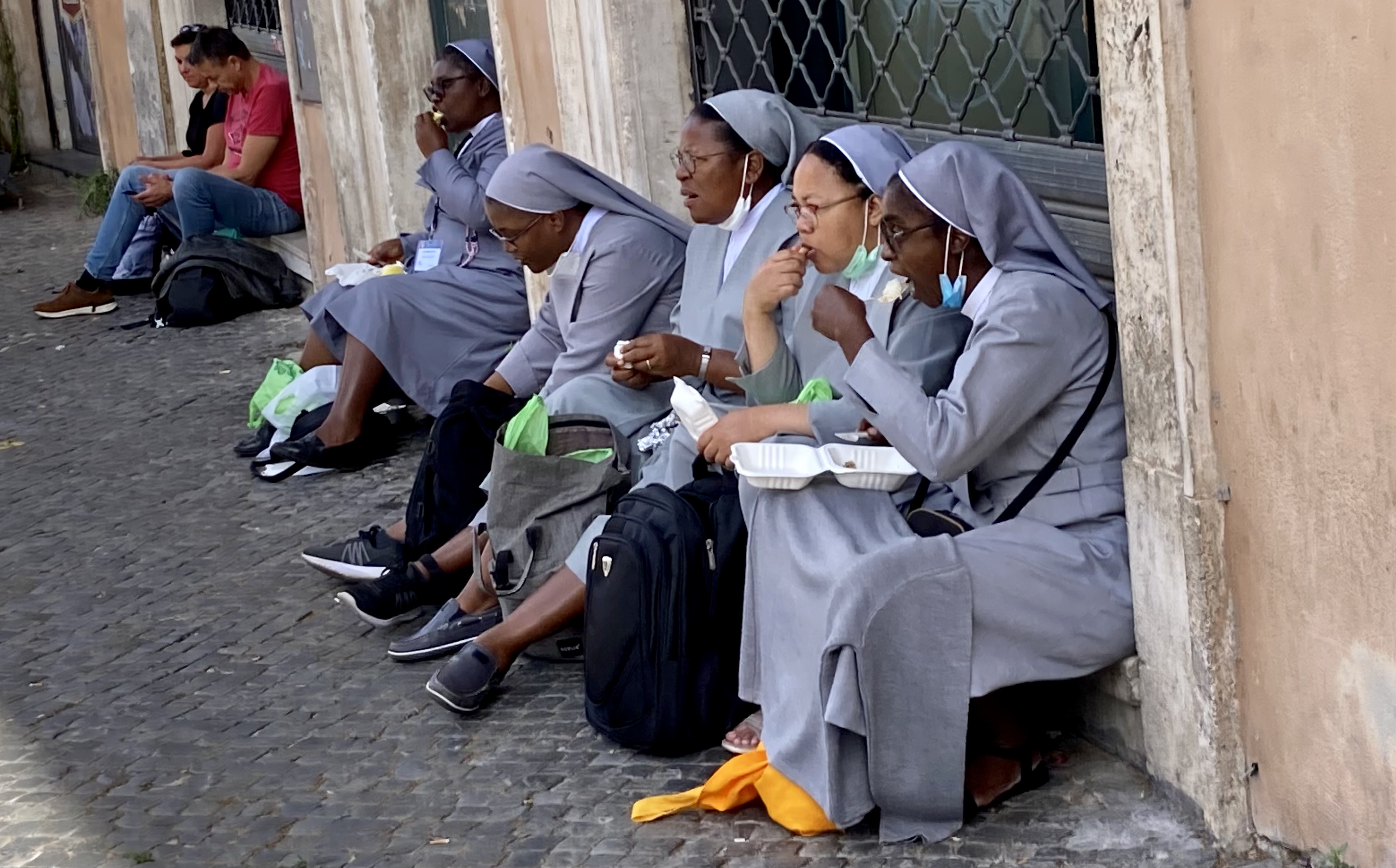 광장의 그늘진 담벼락엔 점심인듯 도시락을 꺼내 드시는 수녀님들이 나란히 앉아 있었다. 로마에 계시는 분들인지, 아니면 시골이나 다른 나라에서 성지순례 비슷하게 오신 건지 몰라도 지친 몸을 잠시 쉬면서 요기를 하시는 것 같았다. 긴옷에 머리까지 가렸지만, 그래도 운동화나 단화여서 다행이다 싶었다.