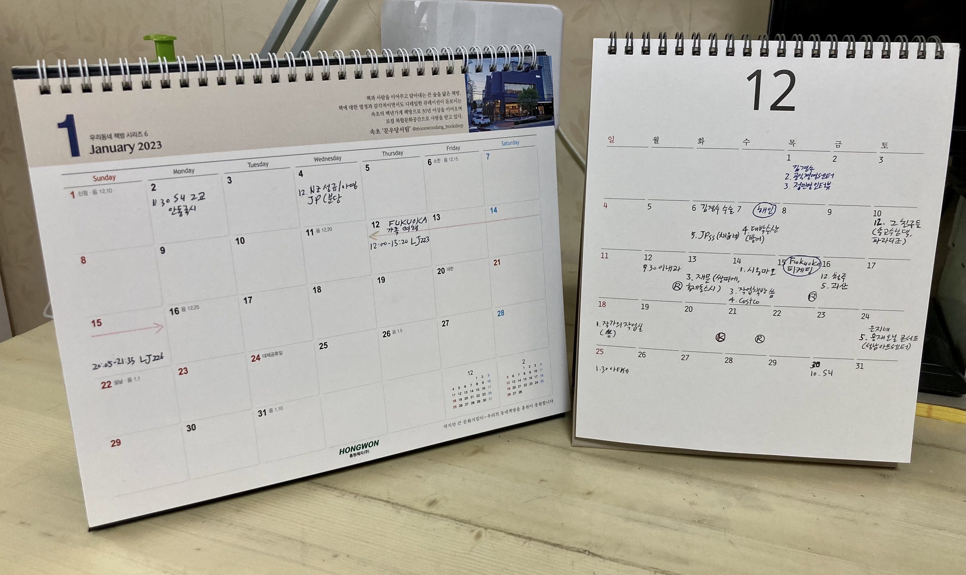 언제까지 탁상 칼렌다를 쓸지 모르겠지만, 없으면 무지 허전했을 것이다. 어쨌든 이렇게 올 한 해 내내 책상에 두고 스케줄을 기록할 칼렌다를 얻어 기쁘다. 20여년간 모은 것(6/15/22)은 작년에 사진으로 남기고 정리했는데, 작년 것도 한 번 훑어본 후 사진으로 남겨둘 것이다.