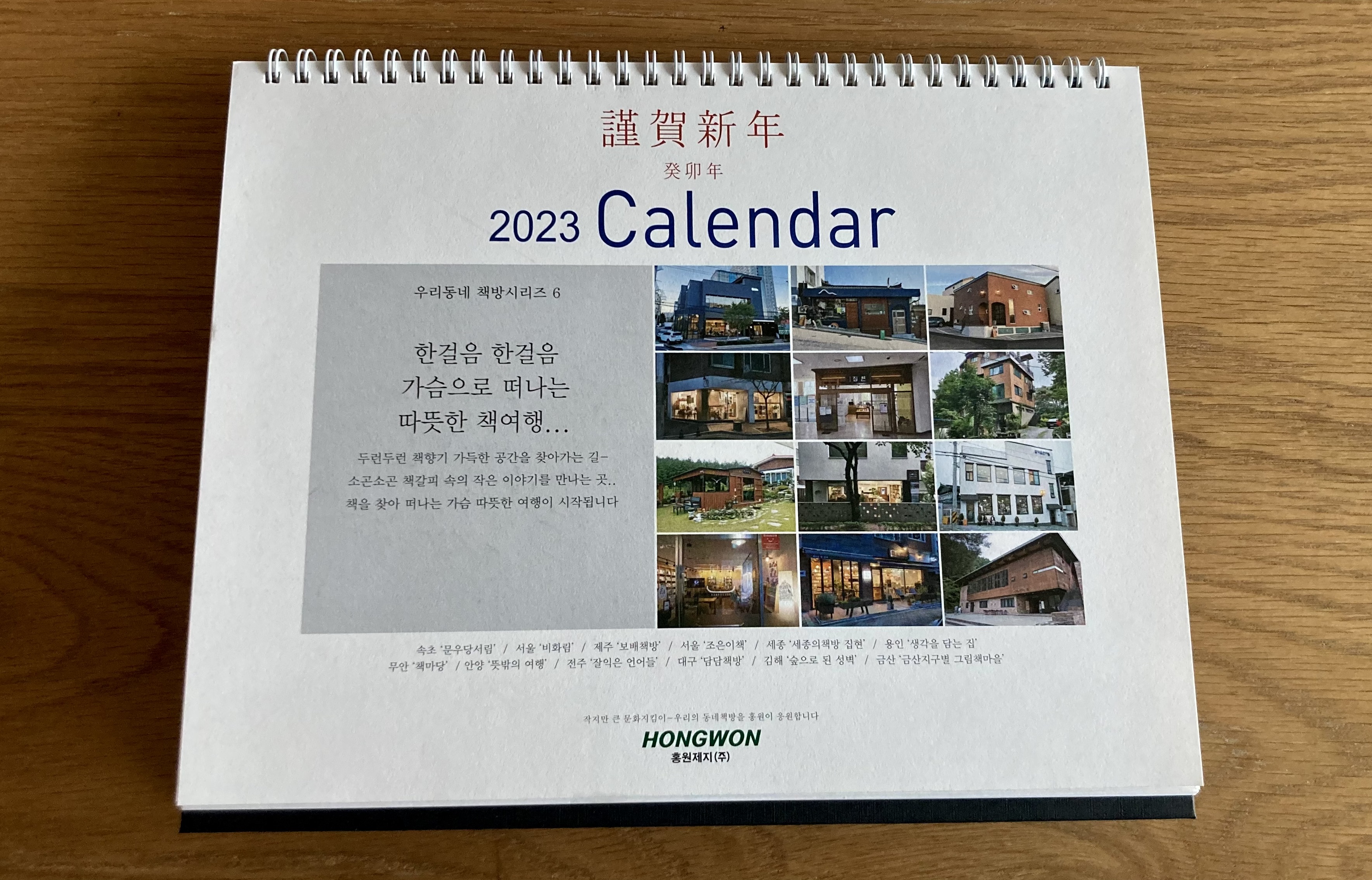제지 회사에서 만든 건데, 한국의 여러 동네 서점들을 소개하고 있어 반가웠다. 속초, 세종, 무안, 원주, 김해, 금산 등지의 동네 서점 12군데를 다달이 사진과 함께 소개하는 나름 의미 있는 기획에 디자인도 괜찮다. 하긴 제지회사들이 아무리 출판을 위한 용지를 생산해 내더라도 서점이 없으면 독자들에게 전달되기 어려울 테니, 소개할만 하겠다 싶었다.