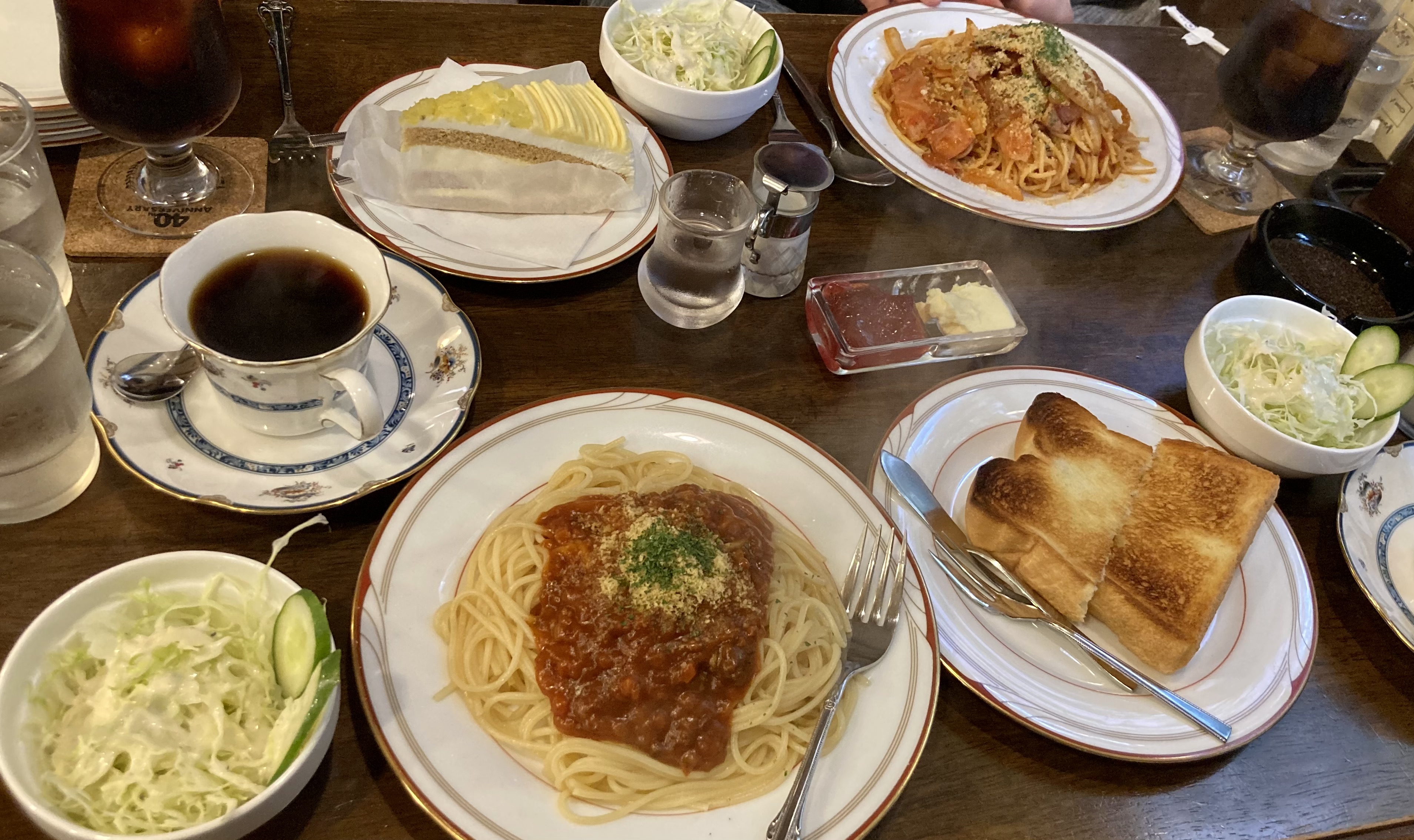 우리도 아침으로 토스트와 스파게티 두 종류(나폴리탄, 미트볼), 조각 케이크를 시켰다. 양배추 사라다와 함께 나온 나폴리탄 맛이 괜찮았고, 구워 나온 두꺼운 식빵 위에 버터와 딸기잼을 듬뿍 발라먹었다. 커피는 바로 내린 게 옛날 커피잔에 나왔는데, 아내는 커피 맛이 좋았다고 했다.