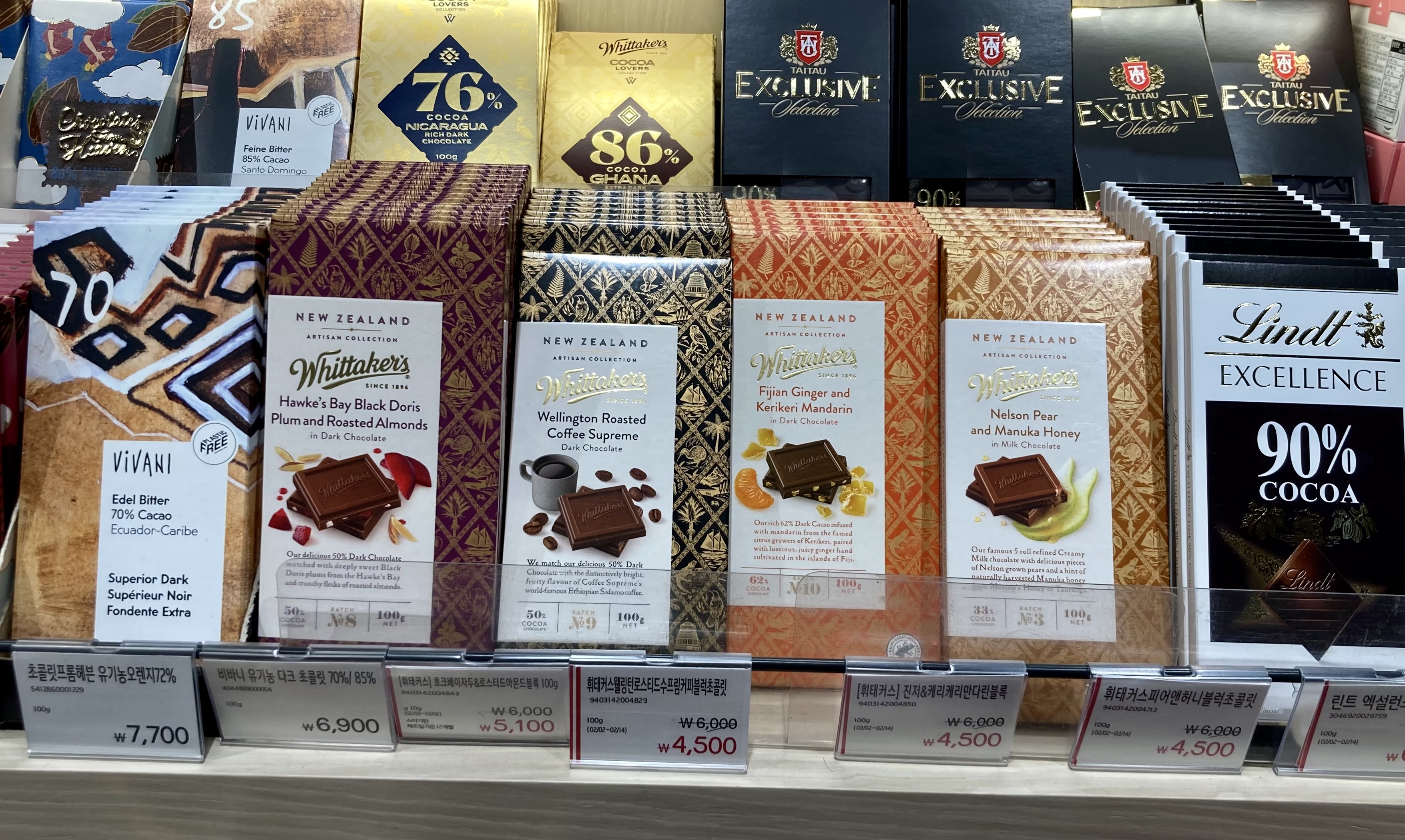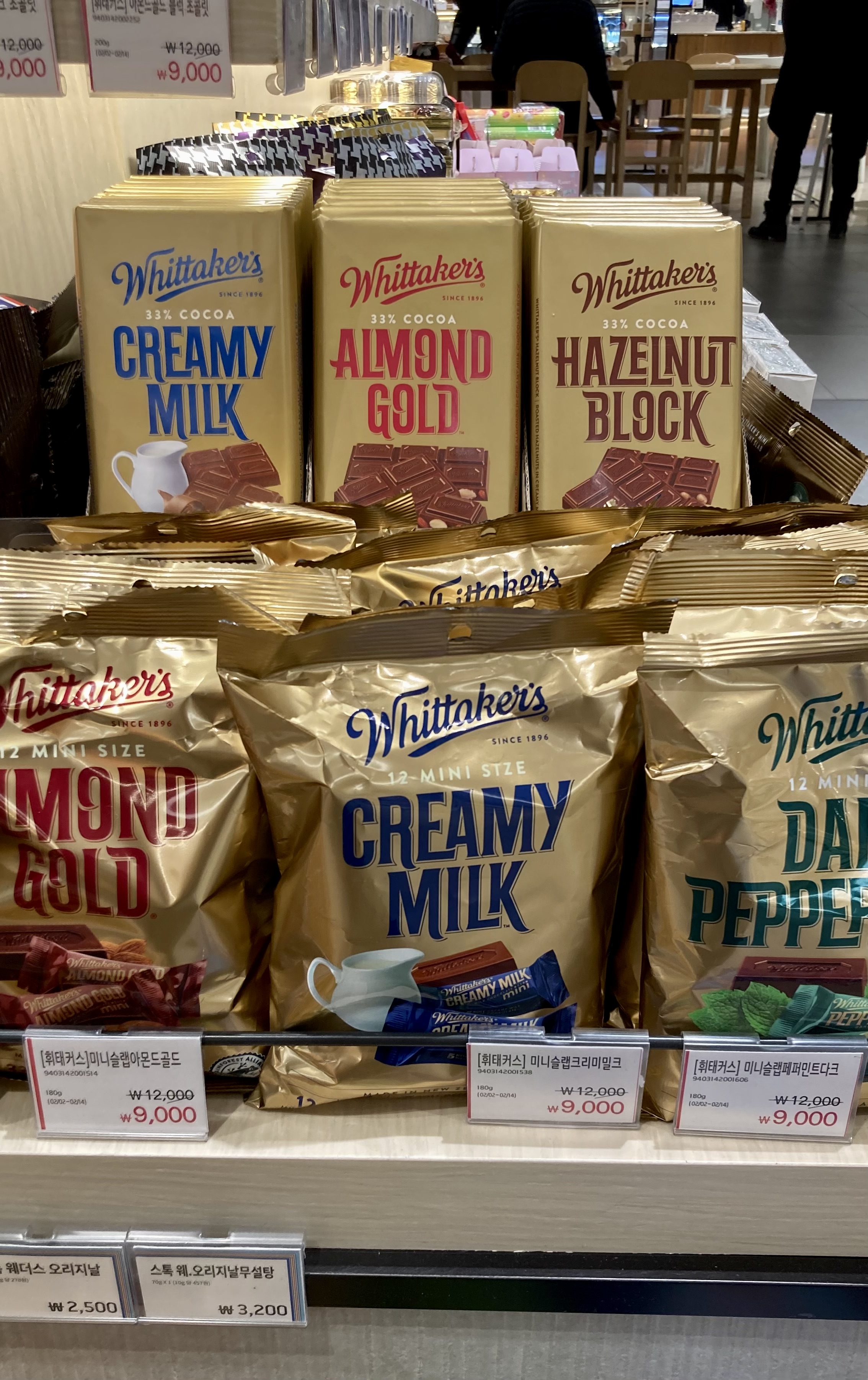아내와 바람 쐬러 집에서 20여분 거리에 있는 남양주 현대 아울렛에 갔는데 1층에 마트가 있길래 잠깐 둘러봤다. 그리 넓진 않았지만, 일본 식품들이 주종을 이루고, 밸런타인 데이를 앞두고 있어선지 초콜릿들이 많이 보였다. 그 가운데 반가운 게 눈에 띄었는데, 뉴질랜드산 휘태커스(12/28/18)도 들어와 있었다.