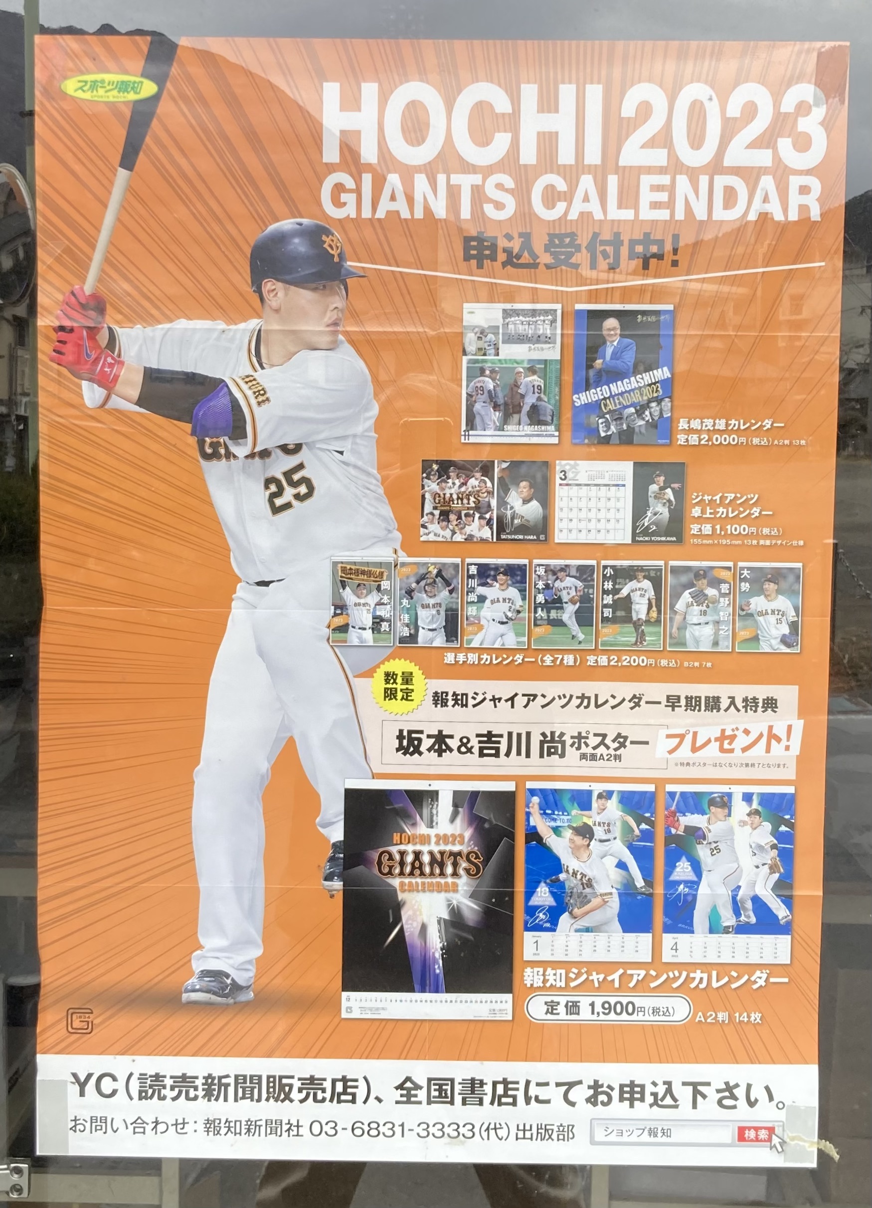요미우리 신문사는 일본을 대표하는 프로야구팀 요미우리 자이언츠의 모회사인지라, 신문 보급소 유리창엔 자이언츠의 2023년 칼렌다를 판매한다는 포스터도 붙어 있었다. 칼렌다를 낸 <스포츠 호치>는 요미우리의 연예 스포츠 부문 자회사인데, WBC 일본 대표팀 선수로 선발된 오카모토(작년에 홈런 30개)가 요미우리의 간판인듯 싶다.
