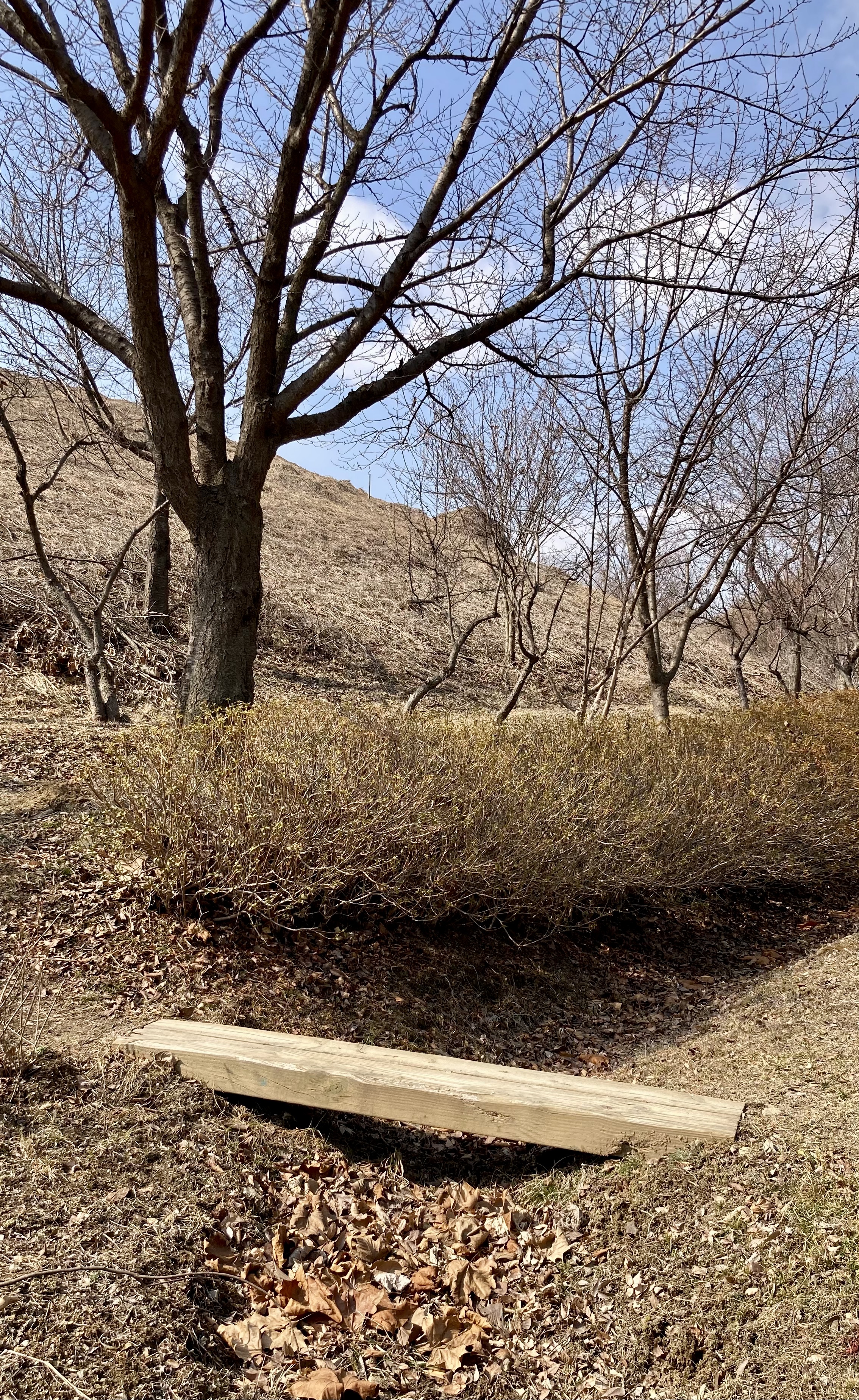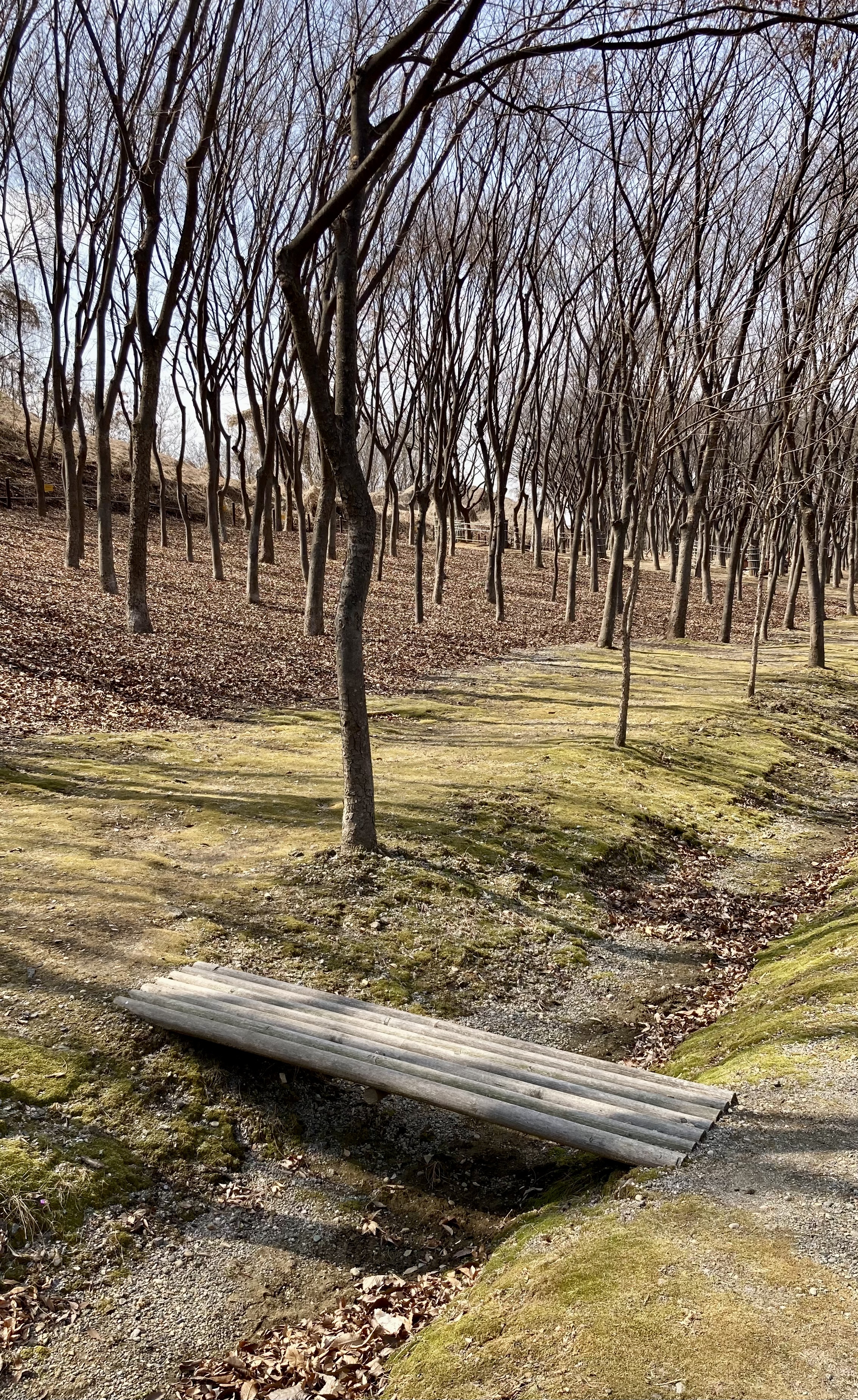 나무들은 좀 더 있어야 볼 게 생겨, 중간중간 이끼가 낀 그리 폭이 길거나 깊지 않은, 물도 흐르지 않는 도랑에 놓인 통나무 다리 옆을 지나면서 건널까 말까 하다가 그냥 지나쳤다. 없어도 그만이지만, 유아숲에 오는 아이들을 위해 놓은 것이겠거니 싶다.