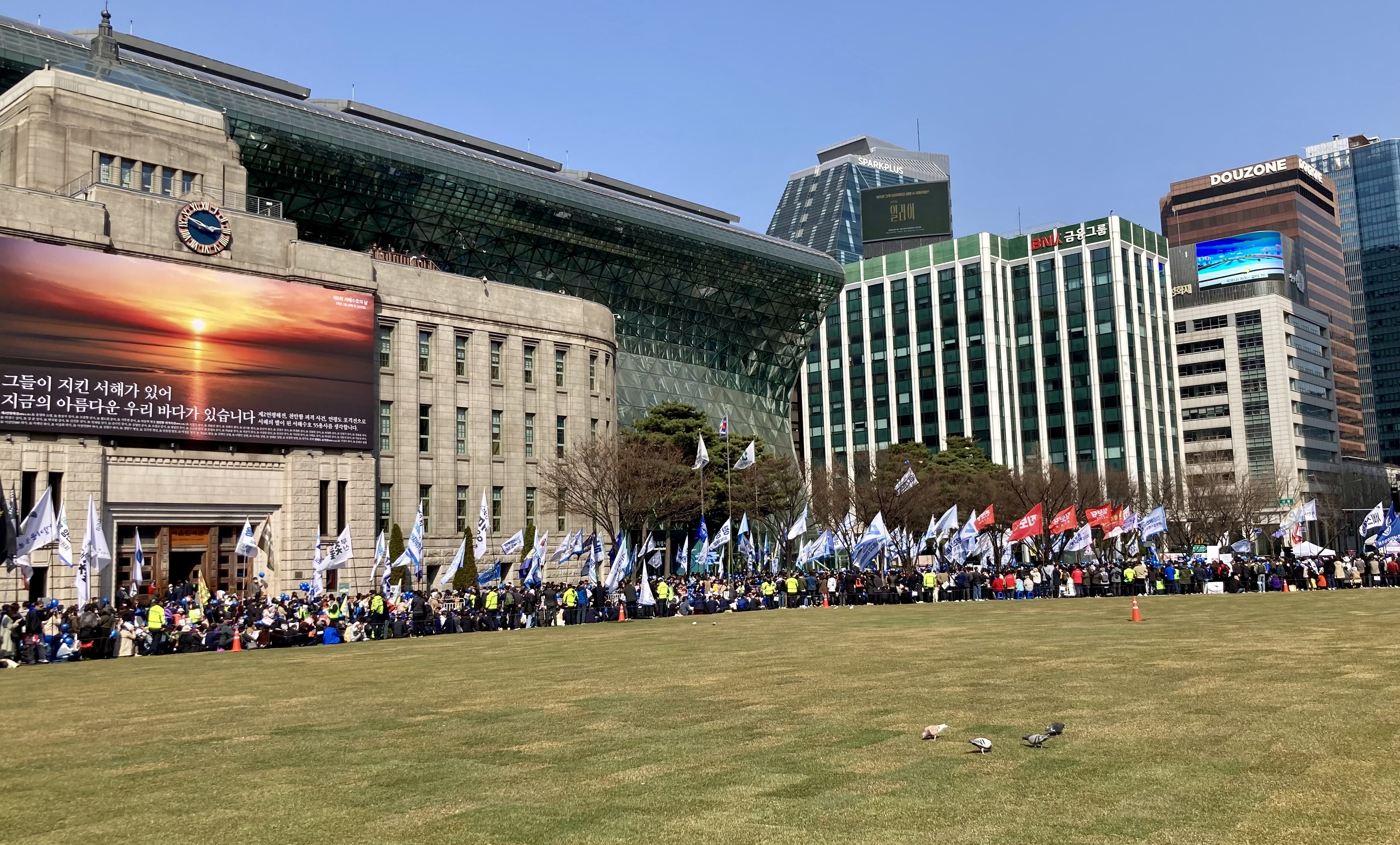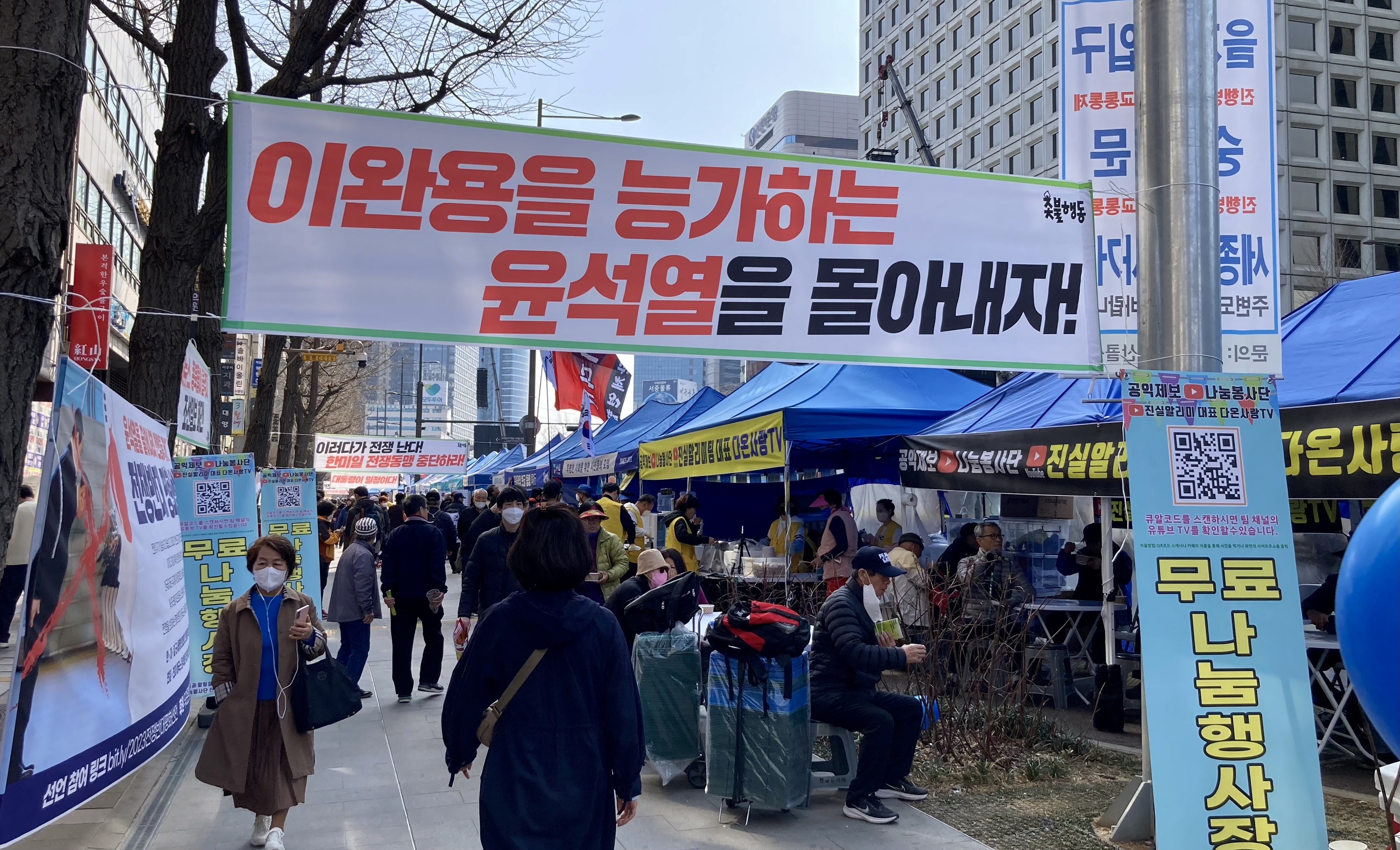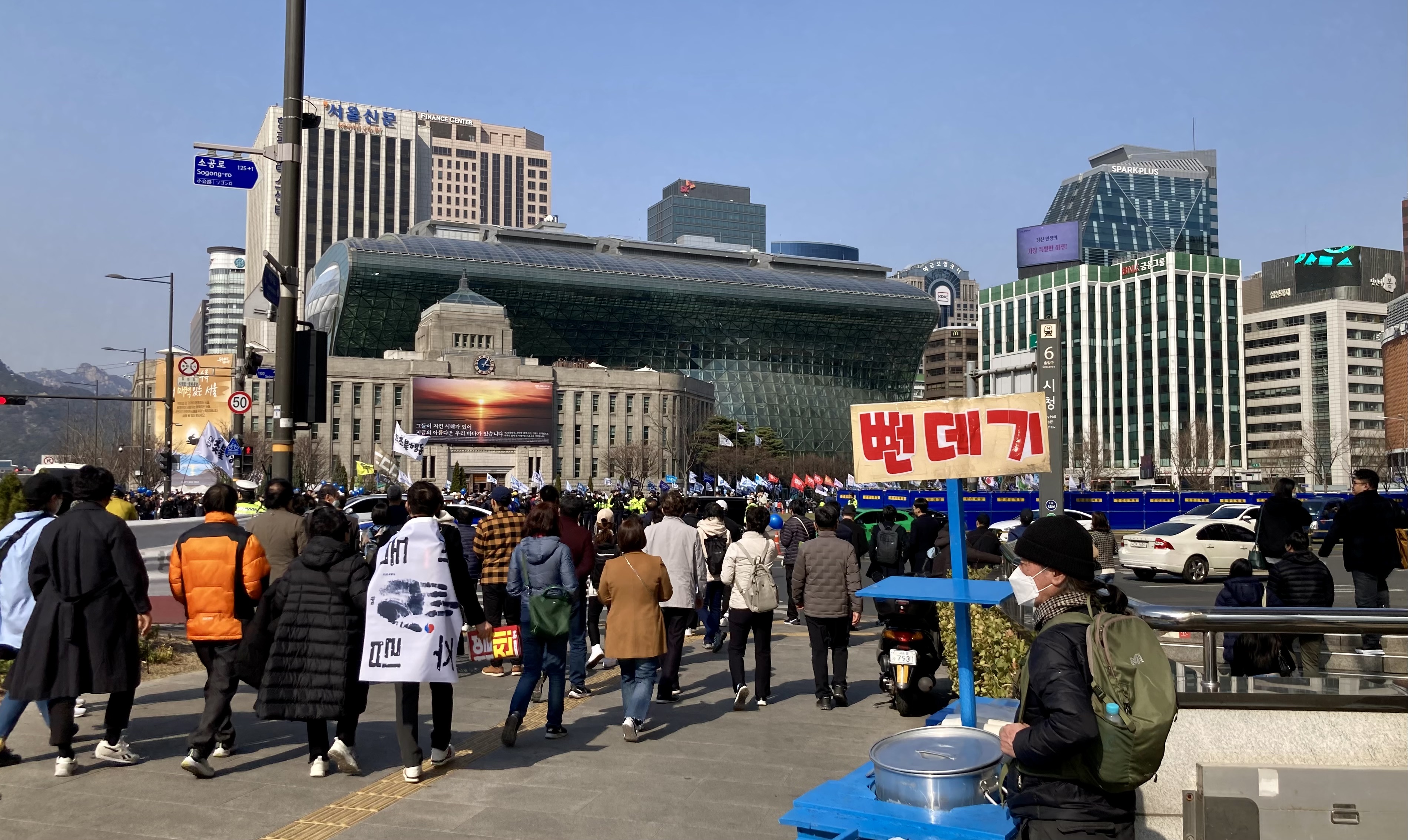 주말에 오랜만에 서울시청 앞에서 열린 시위 현장에 다녀왔다. 윤 대통령의 연이은 굴욕적 친일 발언과 행태를 문제 삼는 시위였다. 뉴스로만 접하다가 현장 분위기가 어떤지 보고 싶어 지하철로 갔다 왔다. 요즘 시청 앞은 광장의 절반 이상을 집회 장소로 모이지 못하게 해 을지로 쪽 연단을 중심으로 길게 모였다.