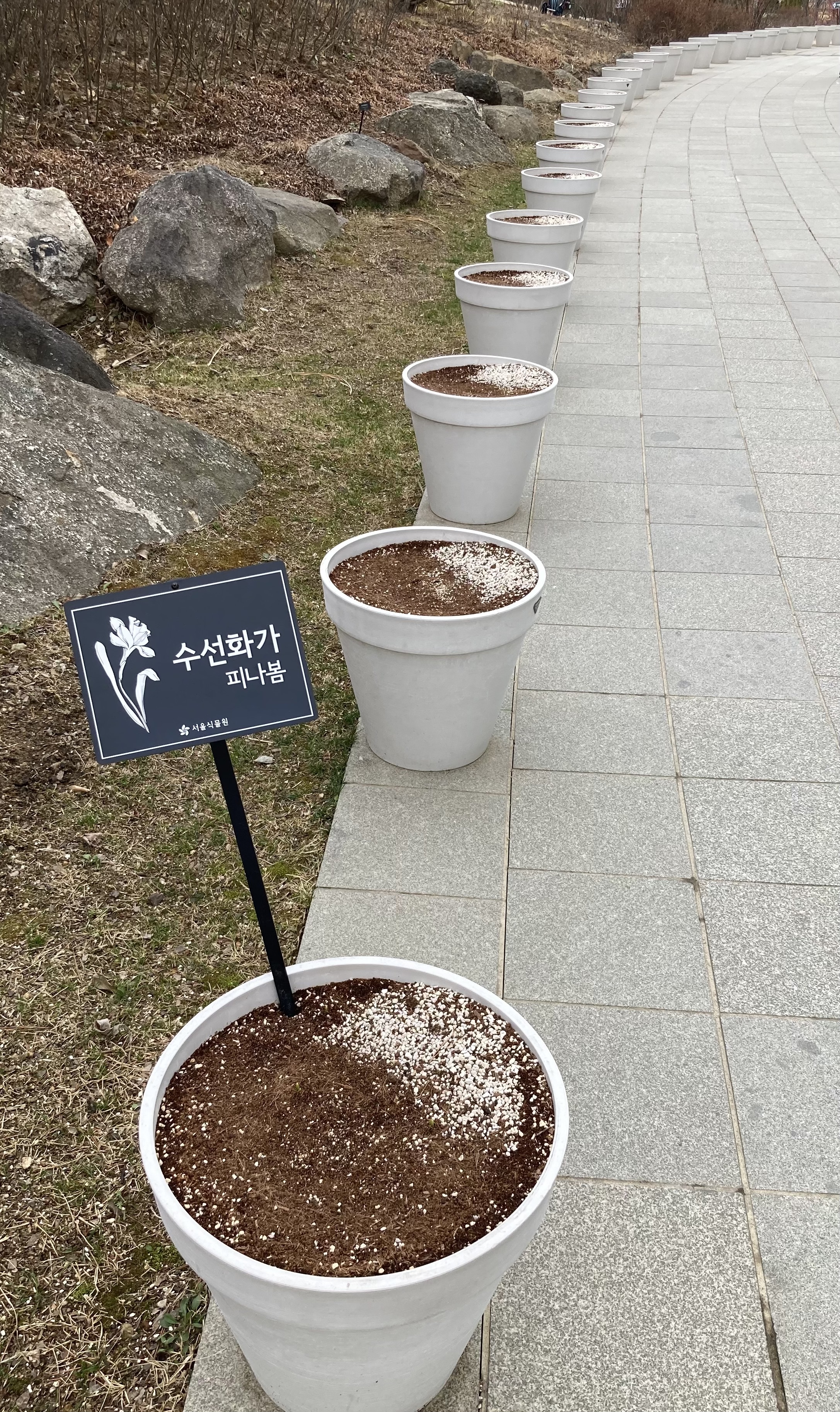 서울식물원은 온실 구경을 마치고 바깥 공원에서 바람을 쐬며 산책할 수 있는데, 안쪽 들어가는 길 옆으로 흰 화분들이 수십 개 도열해 있었다. 꽃이나 잎도 보이지 않아 빈 화분인지 알았는데, 그 중 하나에 팻말이 꽂혀 있었다. 수선화를 심은 모양인데, 팻말엔 '수선화가 피나봄'이라 쓰여 있었다.