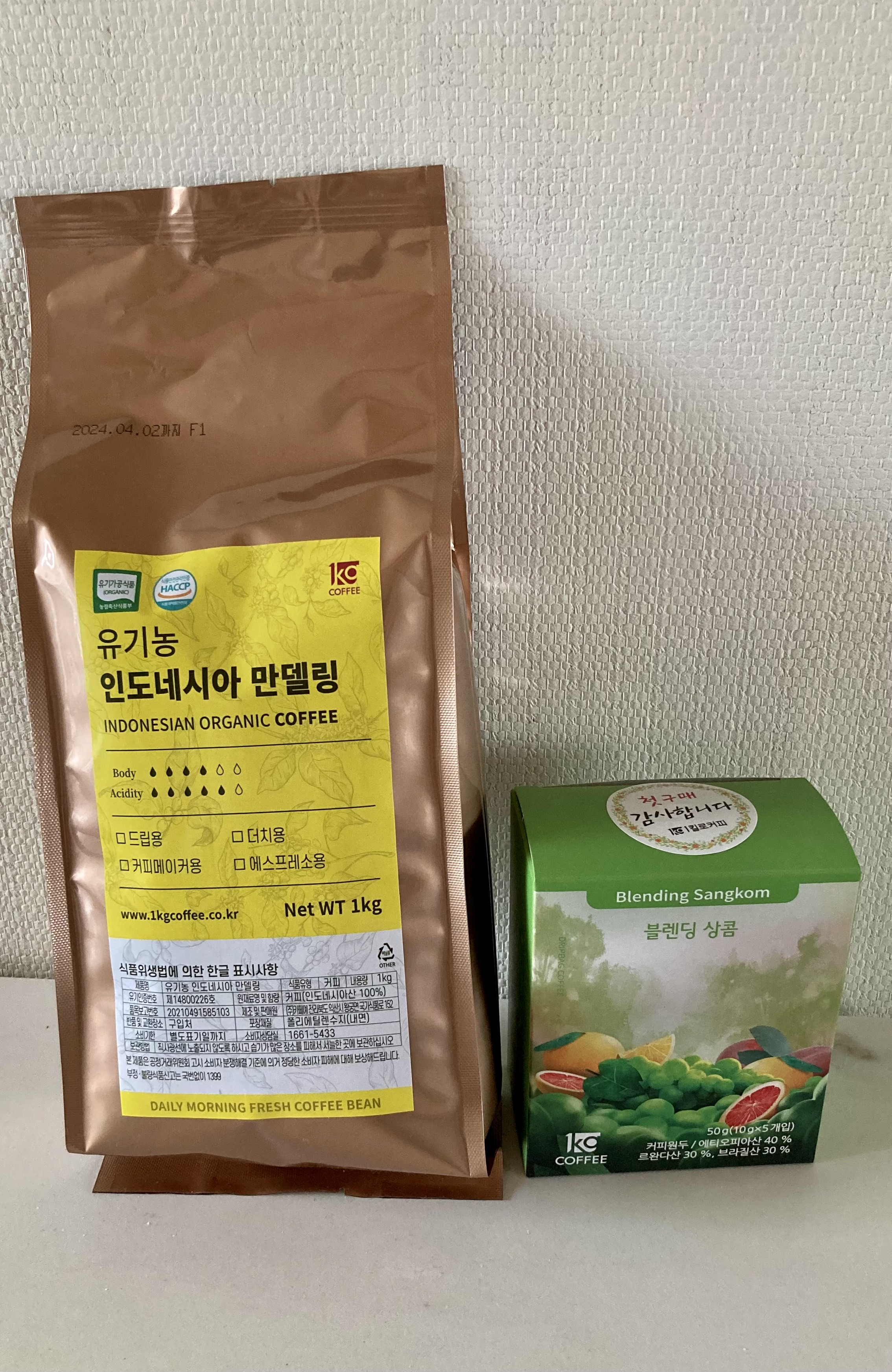 커피 원두가 떨어져서 이번엔 마트에서 사지 않고 '1kg커피'란 데에 주문했다. 성서유니온 사무실에 갈 때마다 마셔 괜찮은 인상을 받고 이름을 기억해 두었는데, 이름 그대로 원두를 1kg 단위로 주문할 수 있다. 이렇게 저렇게 블렌딩한 것들과 싱글 오리진도 여러 가지가 있는데, 유기농 인도네시아 만델링을 주문했다.
