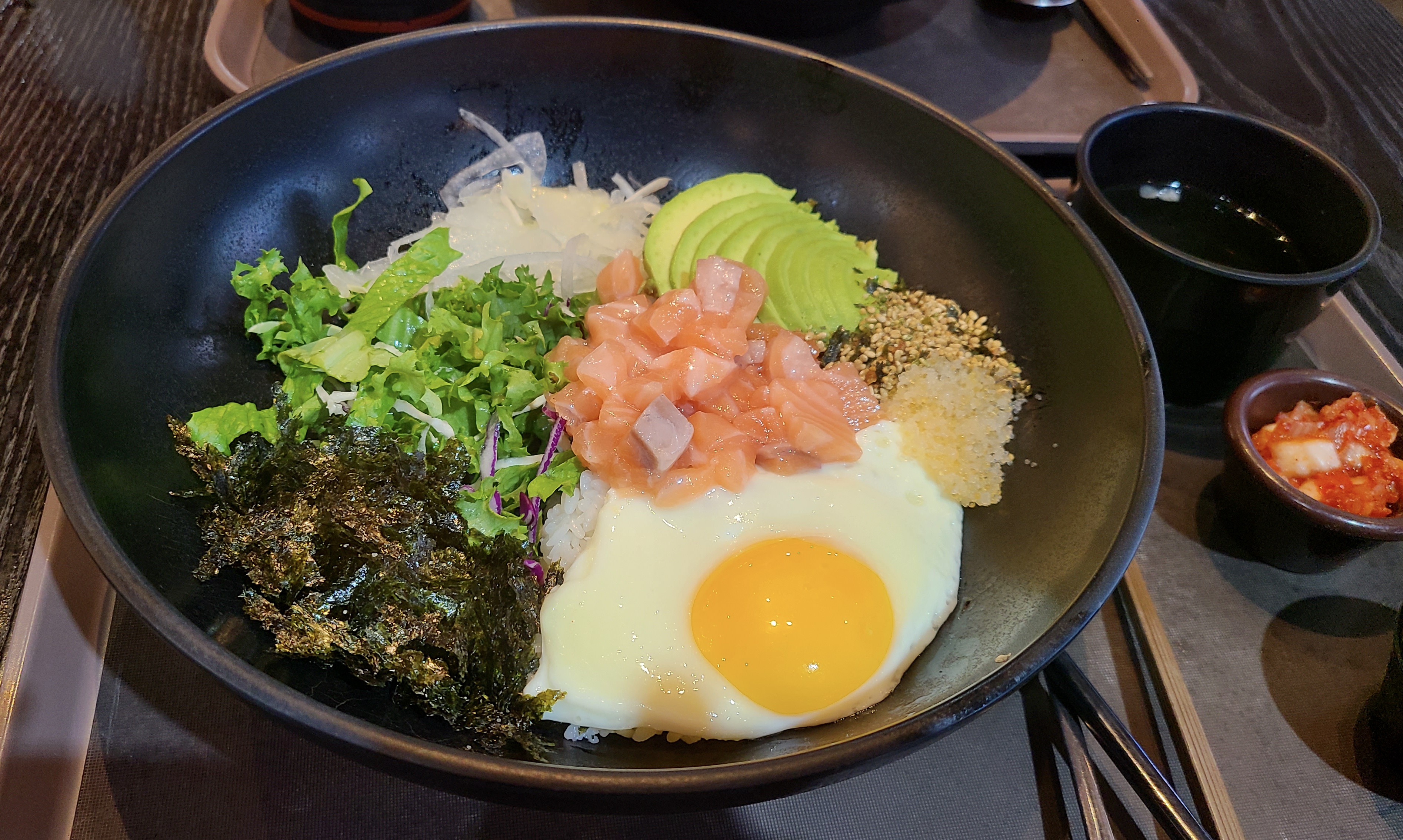 잠실 롯데에서 열린 연주회 전에 저녁을 먹으려고 월드몰 지하1층 식당가 어반 스커트를 둘러보다가 '연아밥'이란 재밌는 이름이 보였다. 연어+아보카드를 올린 비빔밥이었다. 삼겹살 직화구이 비빕밥도 함께 시켰더니, 구성은 비슷한데 메인 고명만 달랐다.