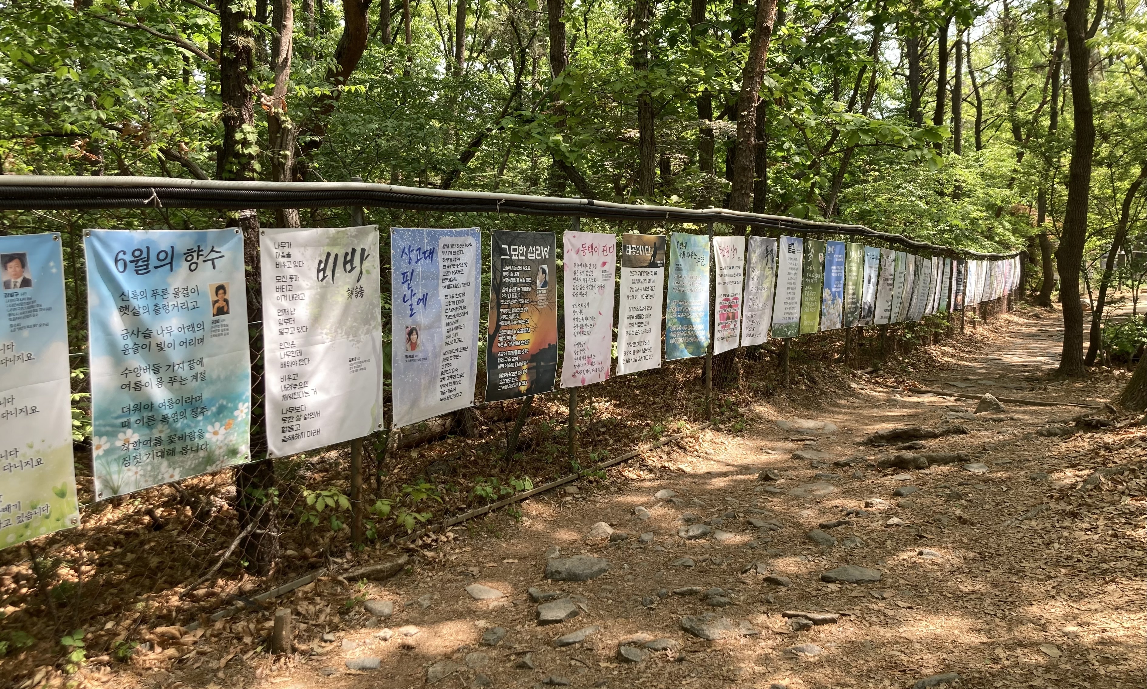 이런 시화전은 지하철이나 고궁 담벽에서 종종 봤는데, 이렇게 야외에서 그것도 산 초입에 걸어 놓으니 새로워 보였다. 길게 호흡을 내쉬고 막 걸음을 내딛으려던 등산객들이 이게 뭐지 하면서 잠시 걸음을 멈추고 감상하거나, 등산을 마치고 내려오는 길에 느긋하게 읽다 갈 수도 있겠다.
