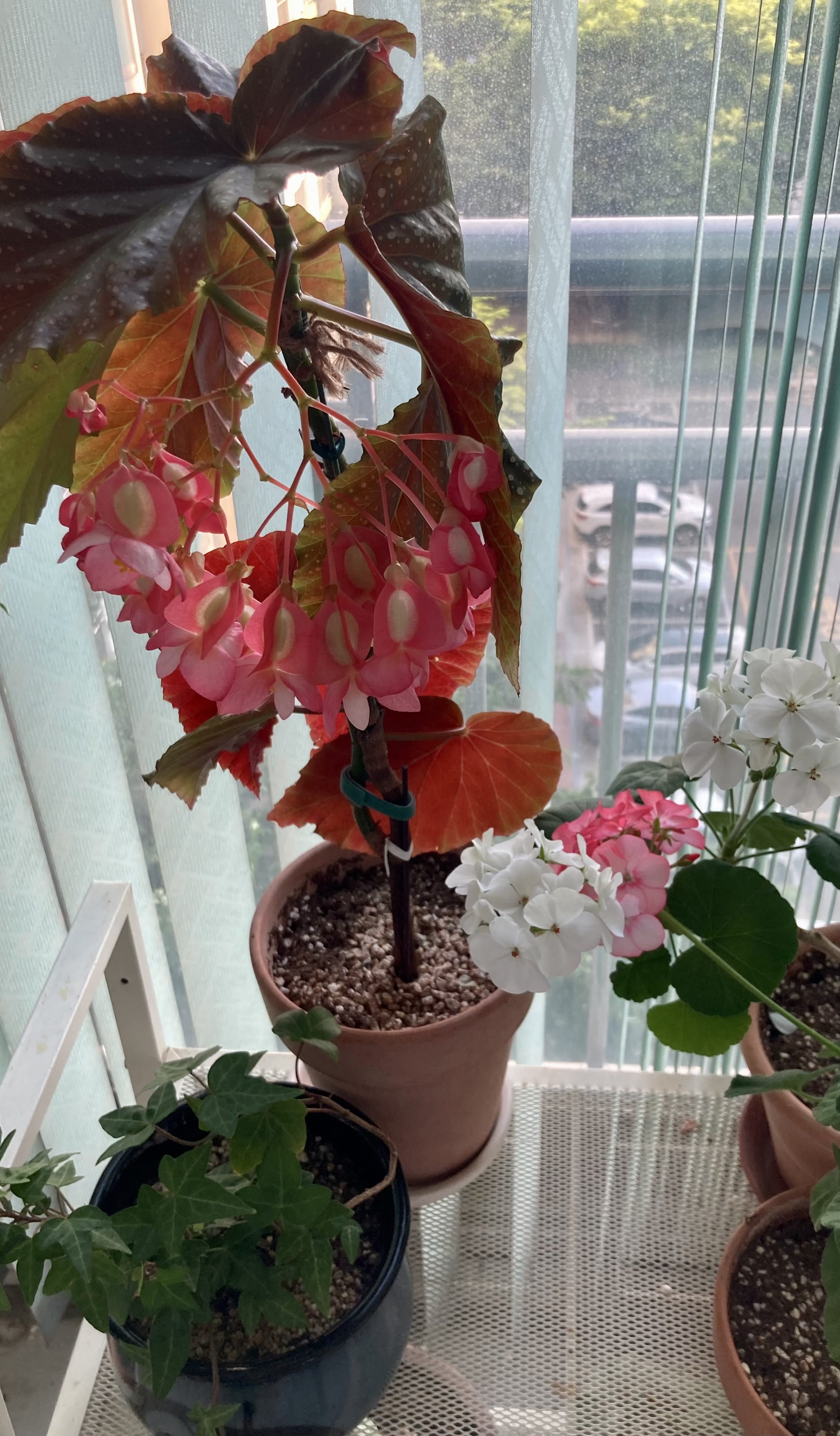 가장 눈에 띄는 건, 암꽃들이 지고 수꽃들이 만발한 엔젤 윙 베고니아(7/23/22)다. 처제네서 분양 받아 온 건데, 이파리도 앞뒤 컬러가 그린과 브라운 컬러로 달라 눈길을 끌더니만, 꽃도 암꽃이 먼저 피더니만 더 화려한 수꽃들이 마치 종처럼 매달려 있는 게 아주 볼만 하다.