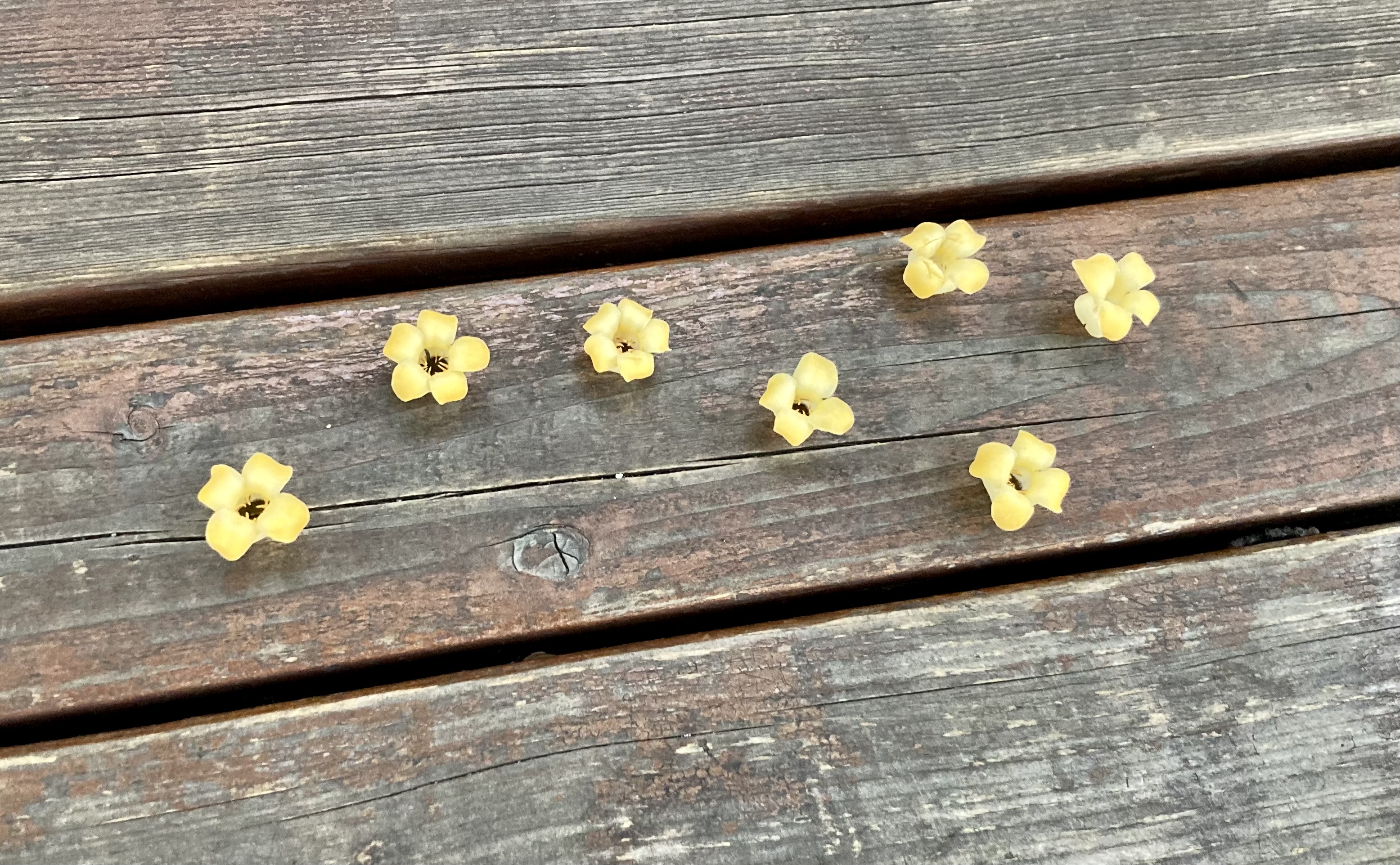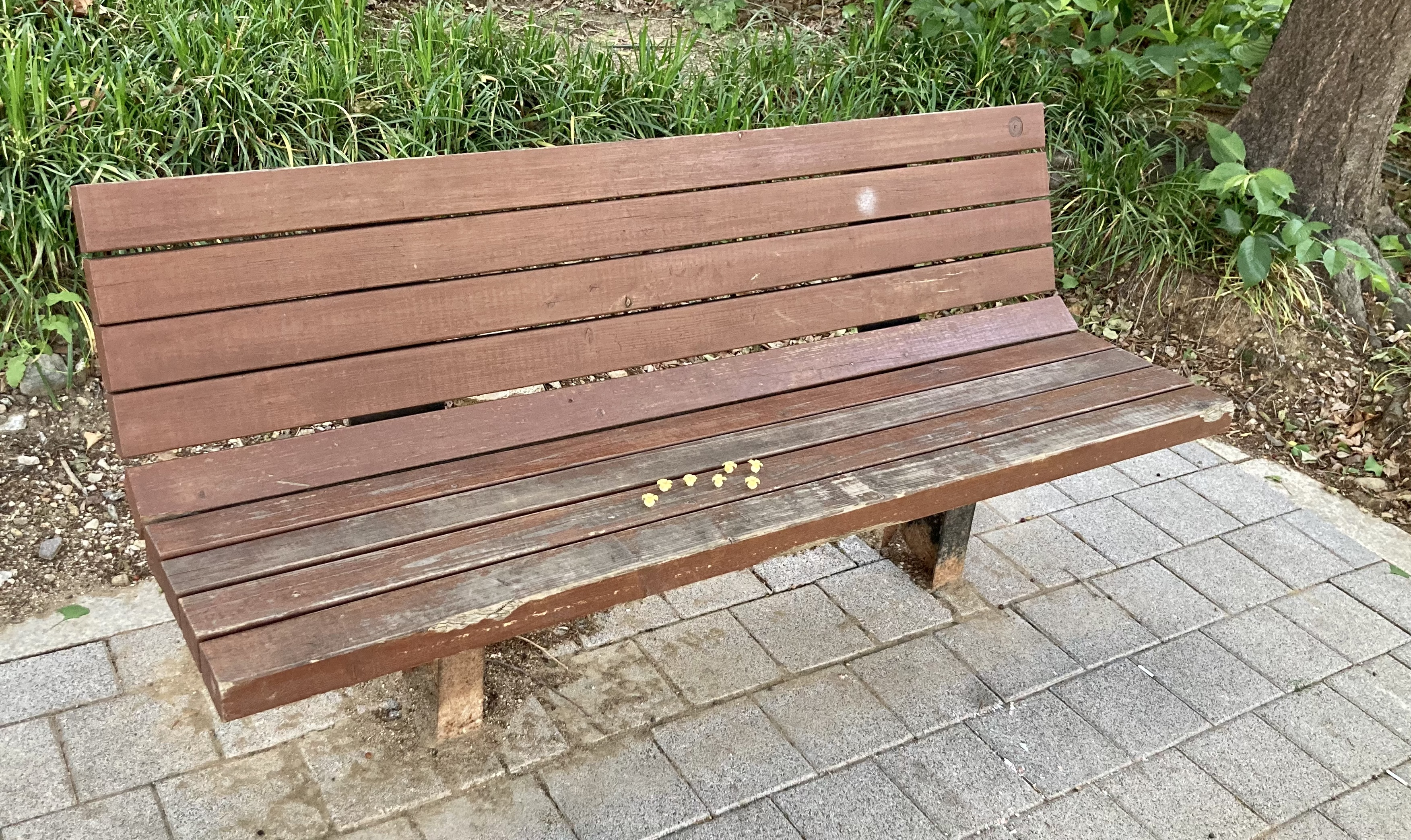 산책길에 벤치 한가운데에 작은 부스러기들이 놓여 있었다. 앉아 계시던 노인분들이 흘린 과자 부스러기인가 했는데, 지나가면서 보니 단정하게 놓인 감꽃들이었다. 게다가 일부러 그런 건지 모르겠지만, 북두칠성 모양새였다. 아마도 근처에 감나무가 있어 떨어진 꽃잎들을 예쁘게 배열해 놓은 모양이다.